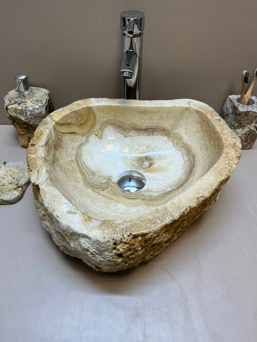 Каждая раковина является уникальным произведением искусства, так как оникс, как натуральный материал, имеет свои индивидуальные узоры и оттенки. Это делает её не просто функциональной частью интерьера, но и важным декоративным элементом.