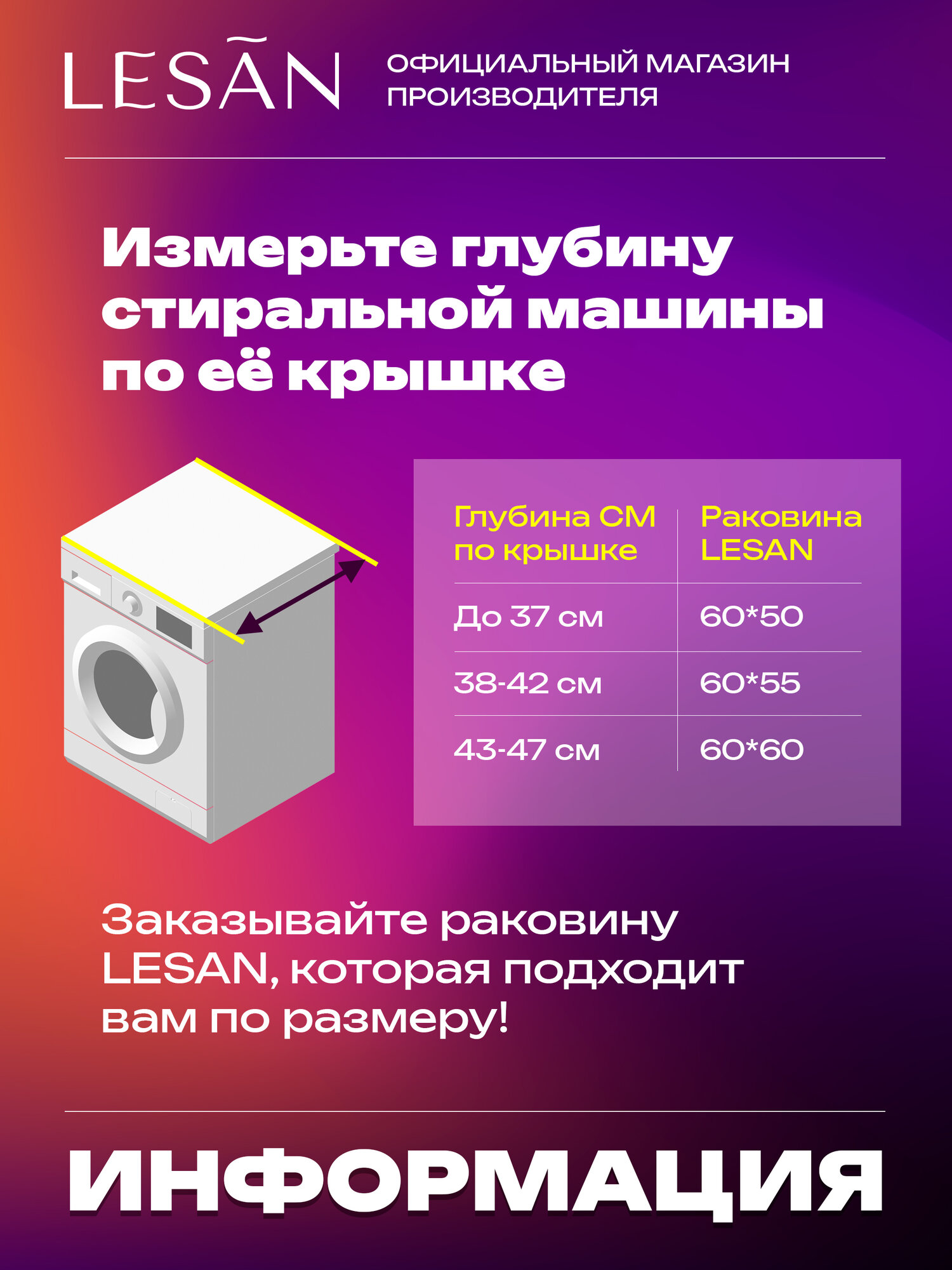 Раковина над стиральной машиной 60x60 акриловая (сифон в комплекте) LESAN современного дизайна – это практичное и стильное решение для ванной комнаты по доступной цене.