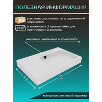 Раковина выполнена из искусственного мрамора, что обеспечивает прочность и долговечность изделия. Материал не впитывает влагу и загрязнения, что облегчает уход за раковиной.