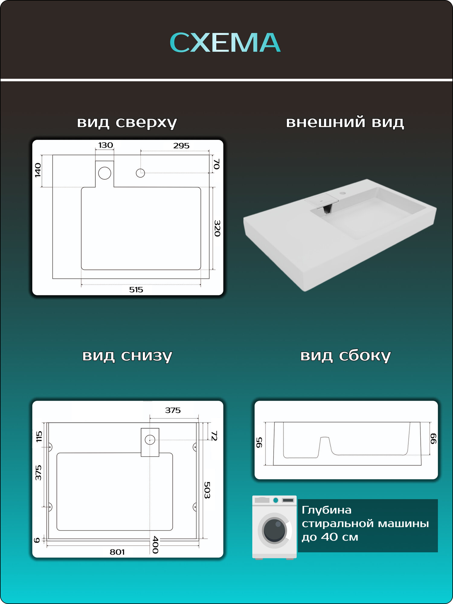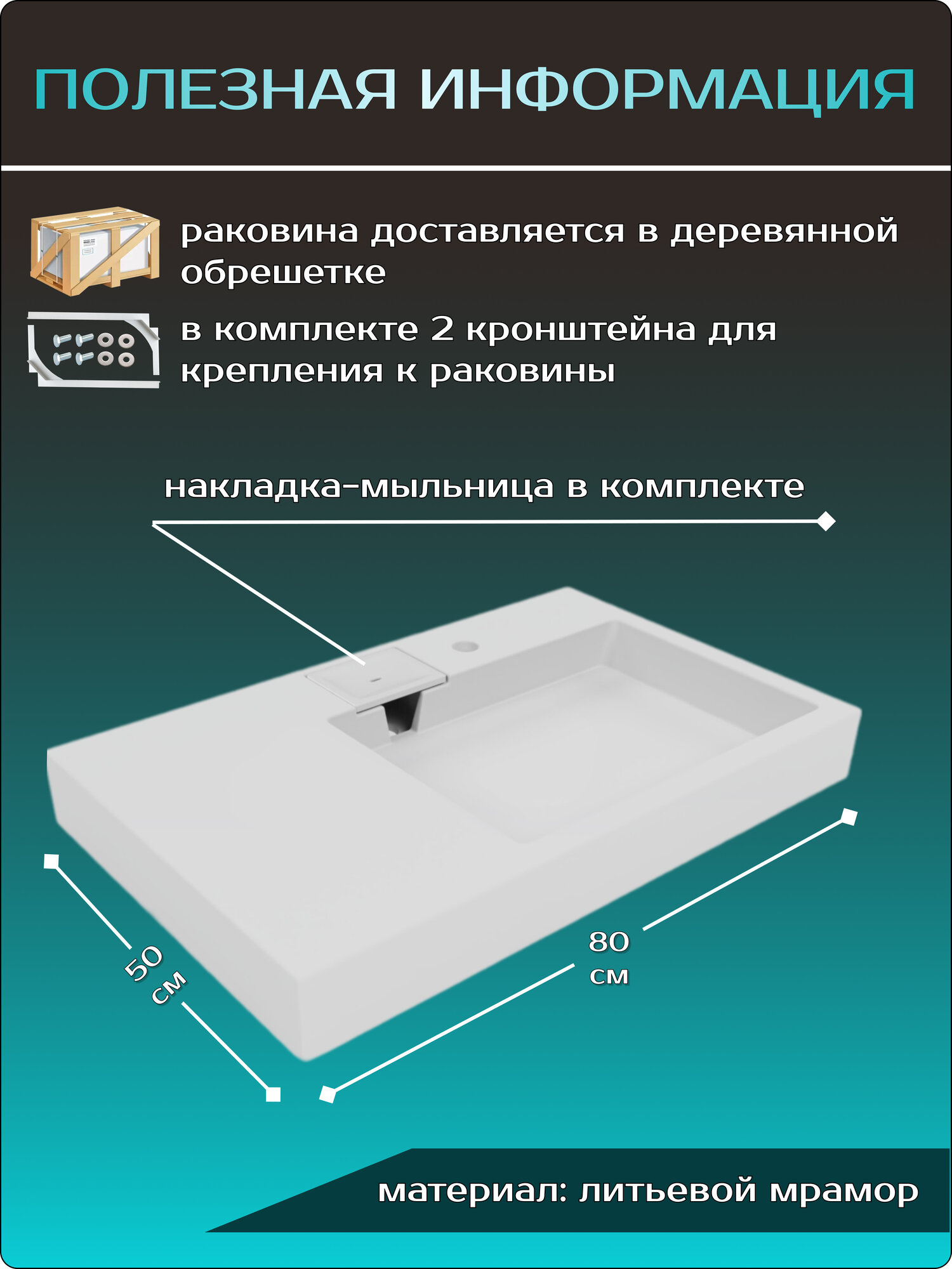 Раковина имеет размеры 80 см в ширину и 50 см в глубину, что делает ее компактной и удобной для использования. Высота раковины составляет 9.5 см, что позволяет разместить ее даже в небольших ванных комнатах.
