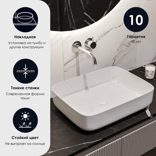 Прямоугольная форма раковины обеспечивает комфортное использование и позволяет экономить пространство в ванной комнате. Накладная установка предполагает крепление раковины непосредственно на поверхность столешницы или тумбы, что придает интерьеру легкости и воздушности.