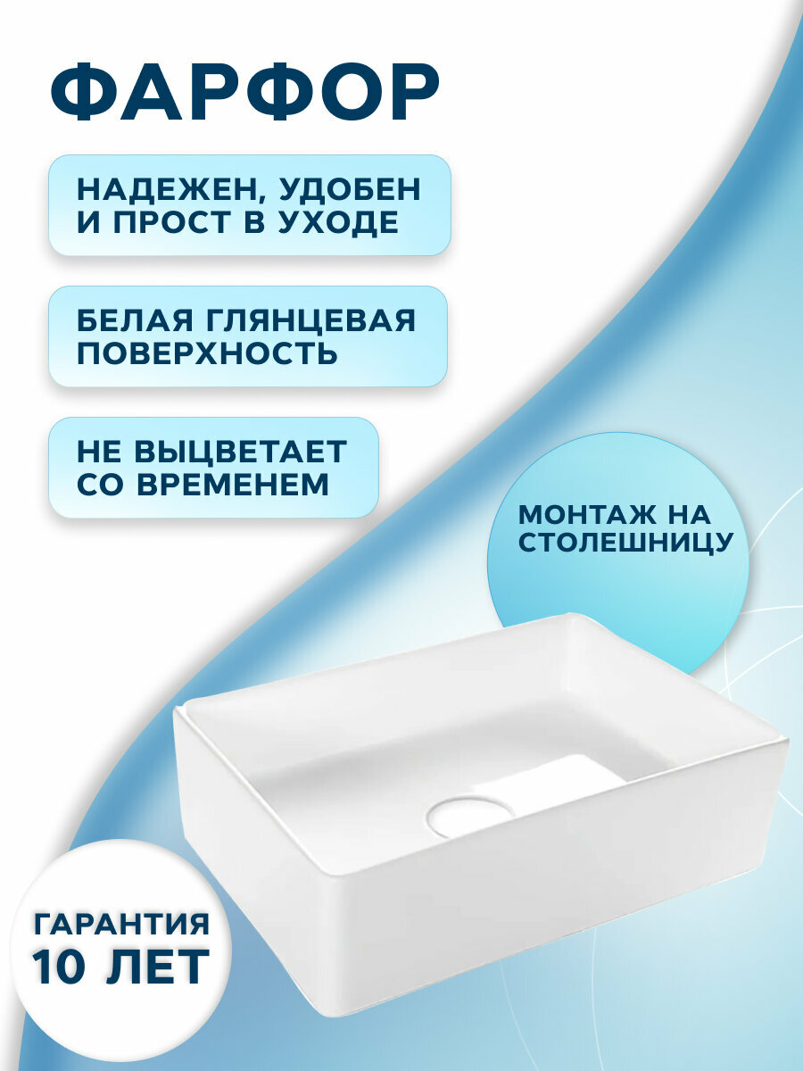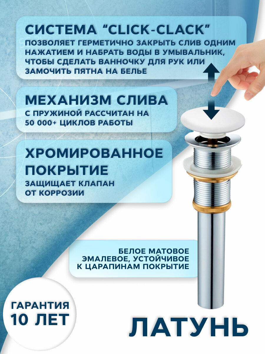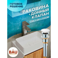 Комплект для ванной от BAUEDGE - современное и оригинальное решение для оснащения ванной комнаты. Прекрасно подходит для тумб BAU артикулов BD1040 и BD1050 Раковина накладная прямоугольная BAU Hotel mini 38х24, белая — это рациональное использование свободного пространства в маленьком помещении — один из самых важных пунктов во время полноценного или косметического ремонта ванной комнаты. Чтобы не занимать место крупногабаритными конструкциями, стоит приобрести накладную раковину. Раковина BAU Hotel подходит для тумб со столешницей практически любых фирм, например: Roca, Cersanit, Triton, Акватон, Акванет, Aqwella, Grossman, Belbagno, Runo и многих других. Раковина изготовлена из санфарфора. Плюсы санфарфора: высокие прочность и плотность, натуральный белый цвет, минимальное влагопоглощение, гигиеничность, долговечность. Состав сырья для санитарного фарфора почти не отличается от фарфора. Это все те же белые глины, кварцевый песок и каолин. Кроме них присутствует еще и полевой шпат. Но вот пропорции, в которых добавляются компоненты, отличаются. Различается и технология производства материала. Формованные заготовки запекают при температуре 750-800˚С. При таком нагреве выжигаются все органические примеси, что дает фарфоровой массе однородный белоснежный цвет. На следующем этапе заготовки покрывают глазуровочной смесью. Однако ее состав тоже другой. Она не содержит пигментов, поскольку фарфор не надо окрашивать. Подготовленное таким образом изделие отправляется в печь, где обжигается в течение часа-полутора при температуре 1250˚С. После остывания материал приобретает высокую прочность и все заявленные эксплуатационные характеристики. Выпуск для раковины BAU клик-клак, хром – это удобная система слива, долговечность и элегантный внешний вид водосливной арматуры. Автоматический слив-перелив системы клик клак удобнее, чем пробки-заглушки и универсальные сливы. Надавливая на крышку, мы приостанавливаем слив воды. Донный клапан клик клак герметичен и позволяет набрать воды в умывальник, чтобы сделать ванночку для рук или замочить пятна на белье. Выпуск для умывальника имеет элегантный внешний вид и хромированную крышку. Оттенок «хром» сочетается с большинством смесителей и с фурнитурой сантехники в ванной комнате. Слив click clack выглядит минималистично и стильно, позволяет выбрать дизайнерские раковины без переливов, стильные и статусные. Механизм слива клик клак с пружиной рассчитан на 50 000+ циклов работы. Корпус донного клапана выполнен из долговечной латуни, а хромированное покрытие защищает его от коррозии. Универсальная резьба делает легким монтаж выпуска с латунными и пластиковыми сифонами.
