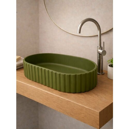 Раковина ребристая накладная для ванной комнаты. "Интерьерный" бетон, технология "холодная керамика". Современная формула с армированием. Очень прочная. Все материалы, применяемые при изготовлении, имеют сертификат соответствия и применяются для организации пищевых производств. Многоступенчатая защита от пятен, эко лаком-пропиткой. Качественная форма, соблюдение технических процессов, материалы и работа мастера позволяют сделать "фабричное качество", но при всем при этом каждая раковина индивидуальна с равномерным цветом по поверхности. Срок эксплуатации десятки лет. Ремонтопригодна.