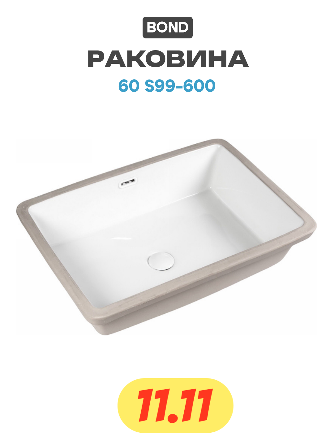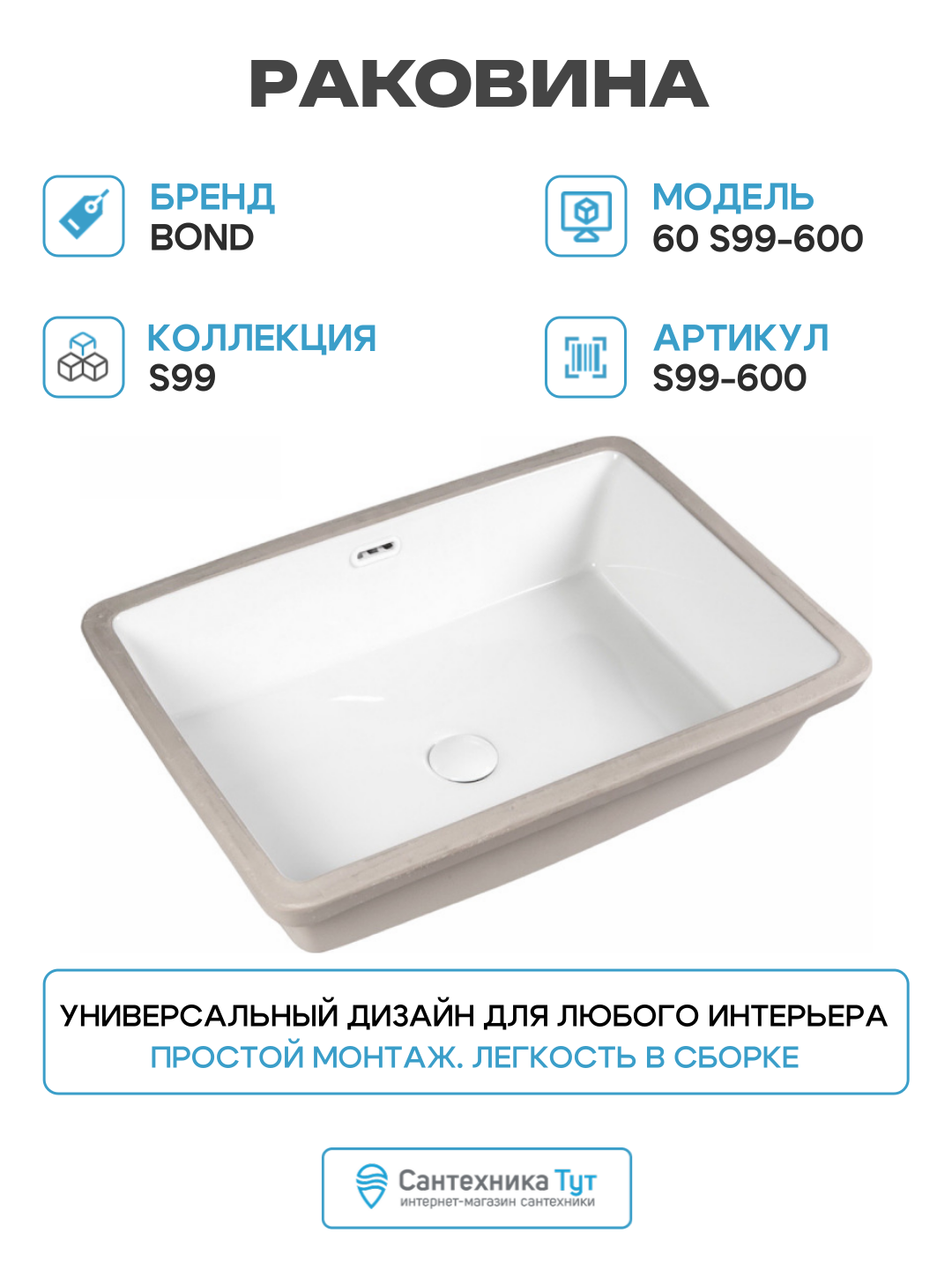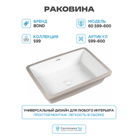 Встраиваемая снизу под столешницу раковина BOND S99-600 является отличным выбором для тех, кто ценит качество, стиль и функциональность в ванной комнате.