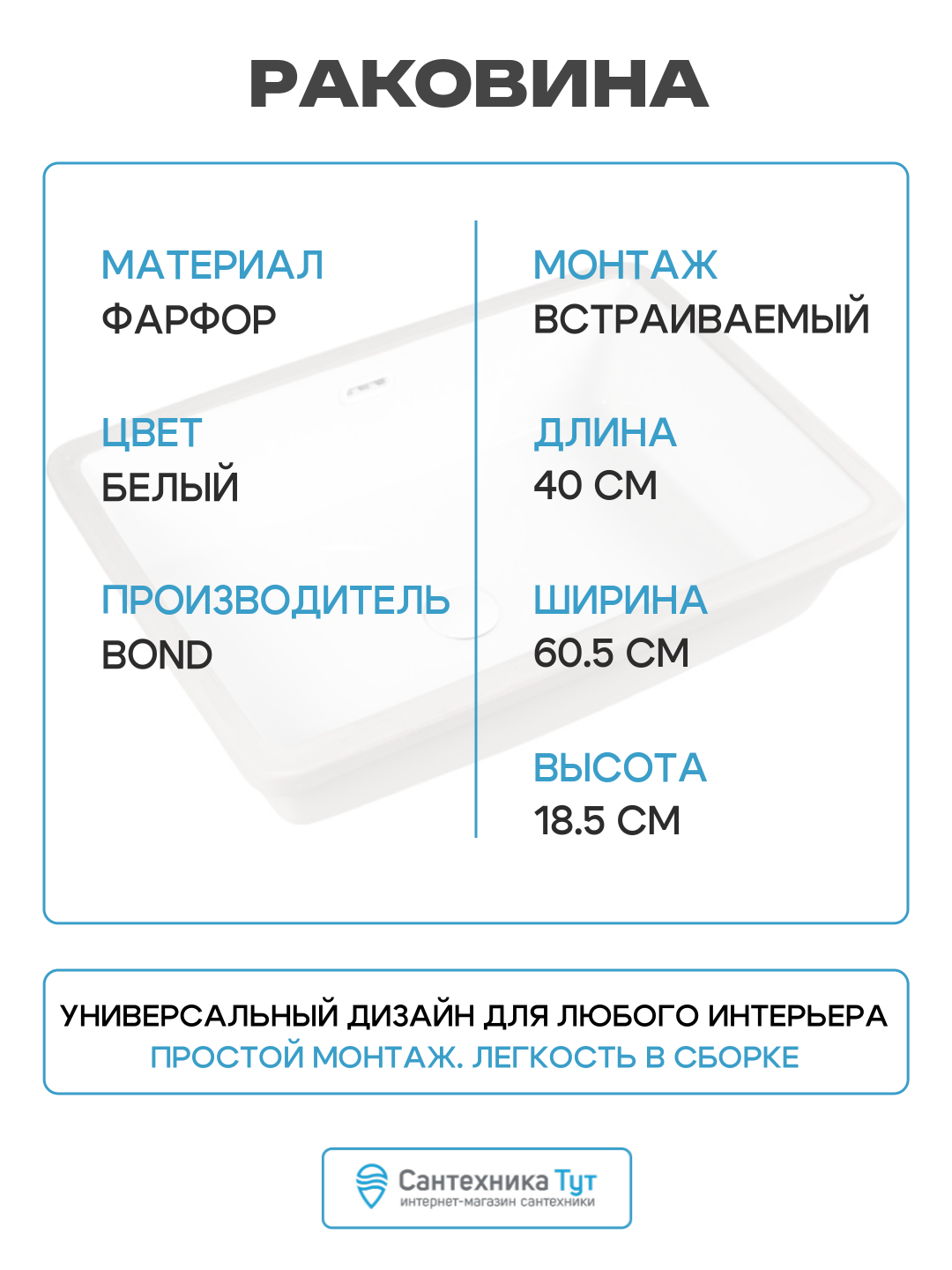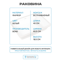 Встраиваемая под столешницу раковина BOND S99-600 представляет собой прямоугольное белое изделие, выполненное из высококачественного сантехнического фарфора, который обеспечивает её прочность и долговечность.