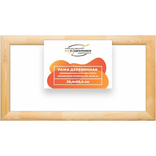 Рама деревянная неокрашенная без стекла и задника, полукруглый профиль, сечение рамы 60х18 мм, изготовлена из древесины сосны 1 сорта.