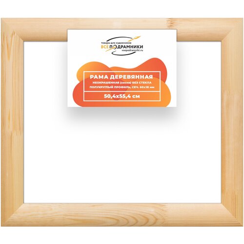 Рама деревянная неокрашенная без стекла и задника, полукруглый профиль, сечение рамы 60х18 мм, изготовлена из древесины сосны 1 сорта.