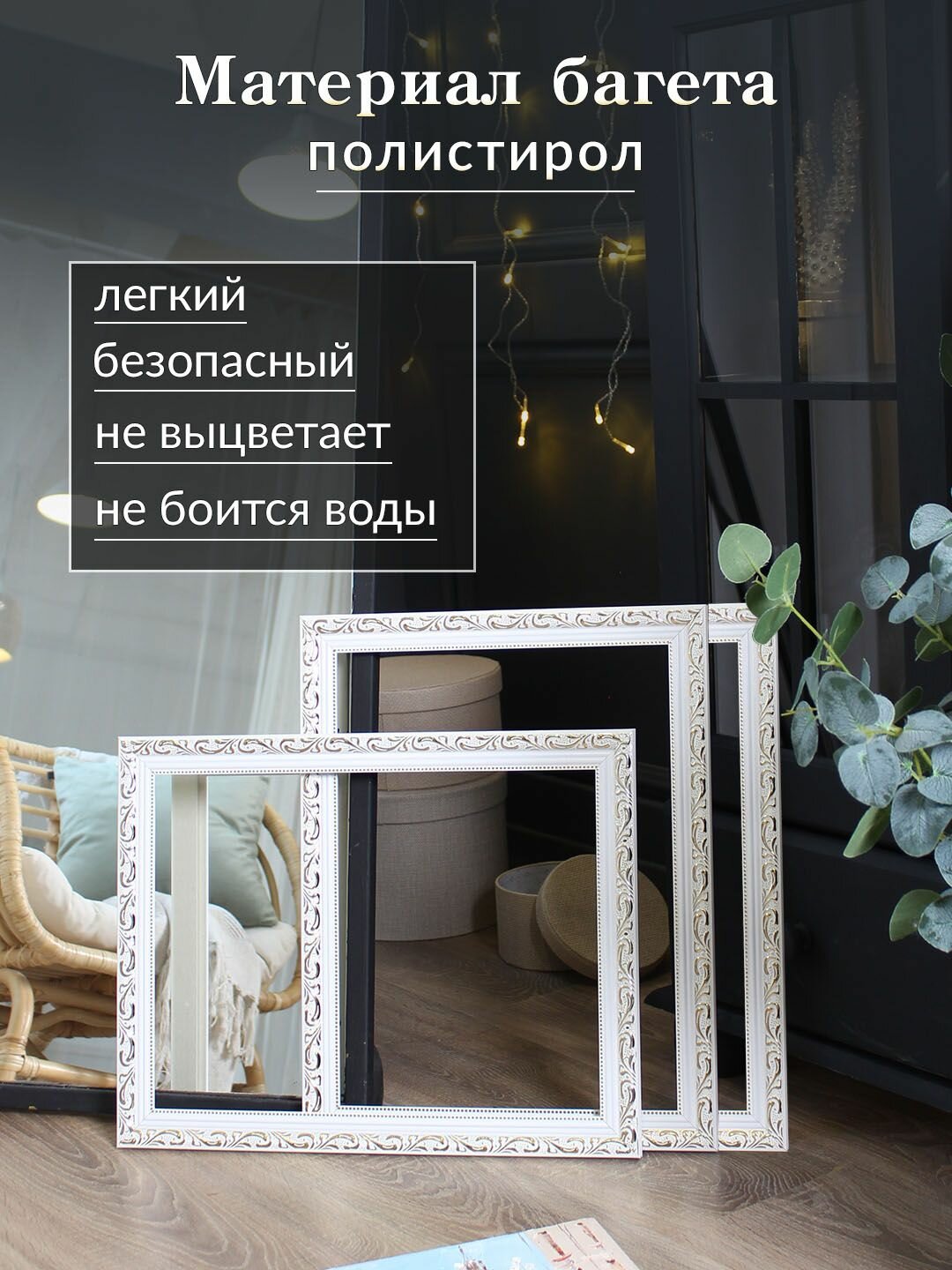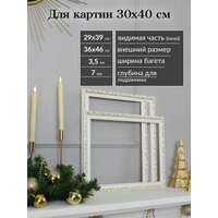 Три белые рамки для картин размером 30х40 см. Багетная рама от «Галерея РА» – это идеальное решение для оформления картин по номерам, алмазной мозаики, вышивки бисером, рисунков на бумаге, постеров, фотографий и других творческих изображений. Эти модели багета выполнены из полистирола и имеют классический дизайн и декоративные узоры, что позволяет придать вашему интерьеру особый шарм и уют. Габаритный размер фоторамки составляет 36х46 см, ширина профиля – 3,5 см. Видимая часть изображения в раме – «окно» имеет размер 29 на 39 см, а глубина четверти для подрамника – 7 мм.