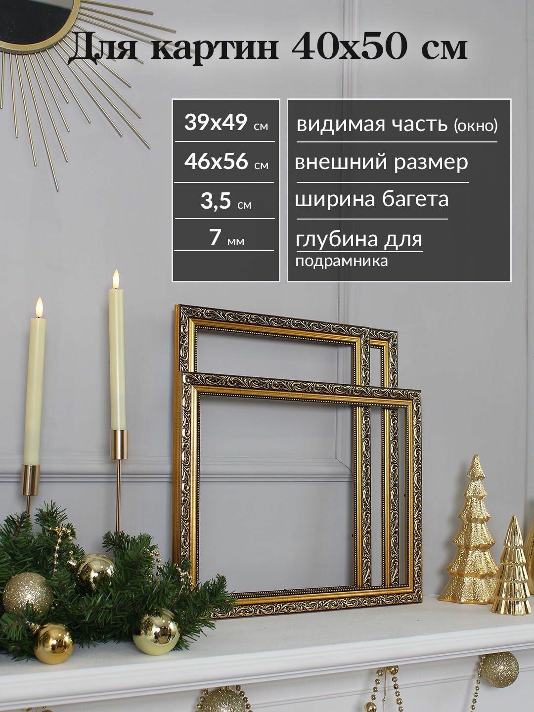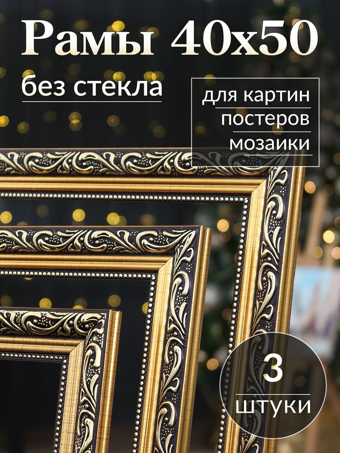 Три рамки для картин размером 40х50 см. Багетная рама от «Галерея РА» – это идеальное решение для оформления картин по номерам, алмазной мозаики, вышивки бисером, рисунков на бумаге, постеров, фотографий и других творческих изображений. Эти модели багета выполнены из полистирола и имеют классический дизайн и декоративные узоры, что позволяет придать вашему интерьеру особый шарм и уют. Габаритный размер фоторамки составляет 46х56 см, ширина профиля – 3,5 см. Видимая часть изображения в раме – «окно» имеет размер 39 на 49 см, а глубина четверти для подрамника – 7 мм.