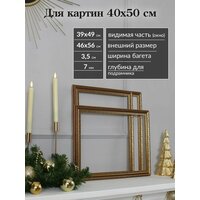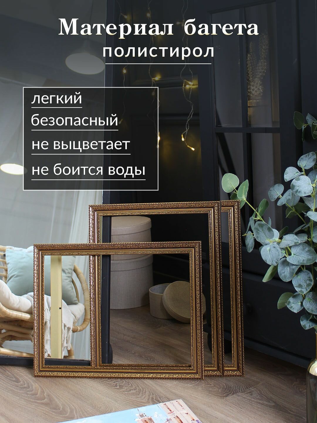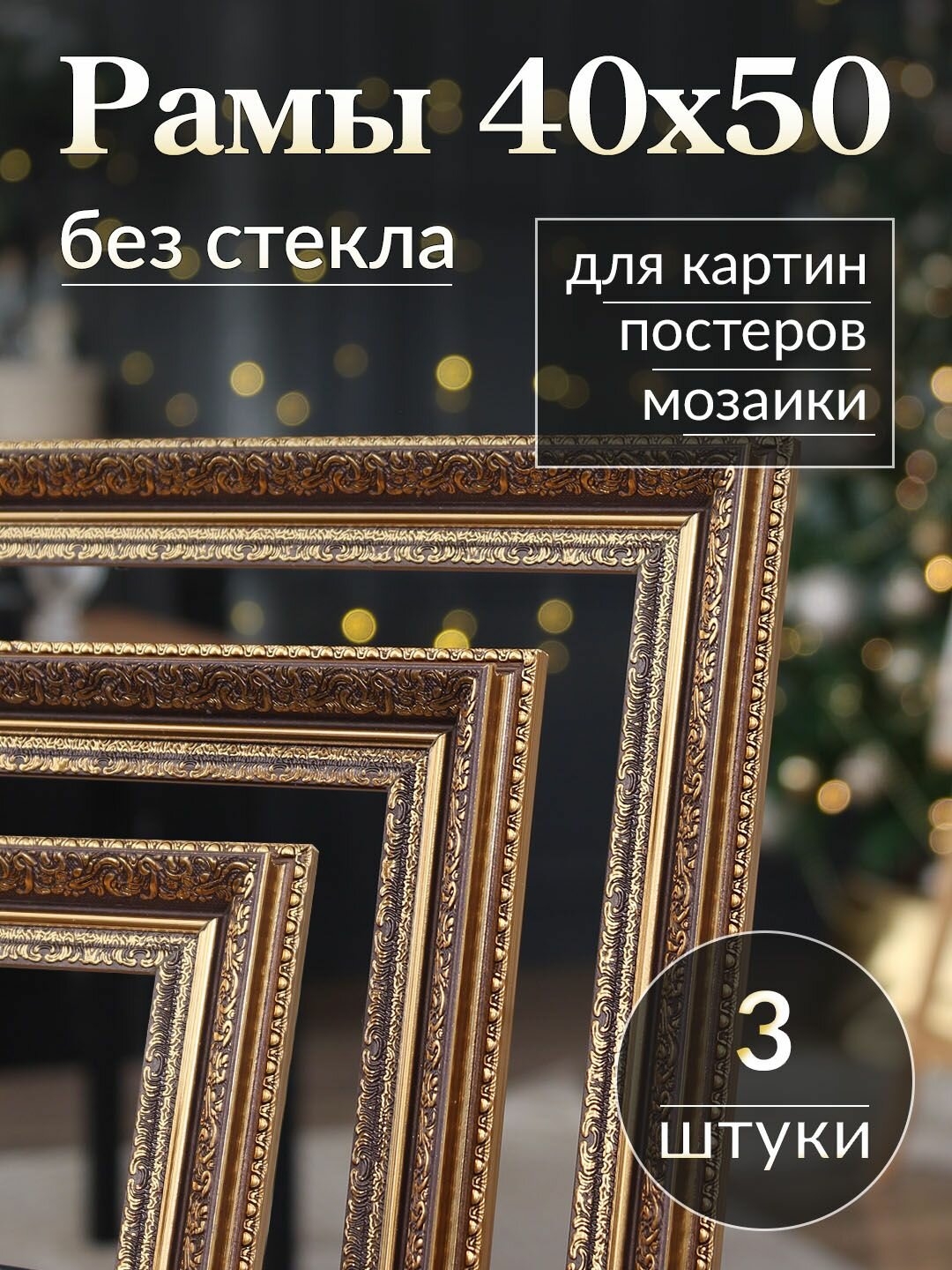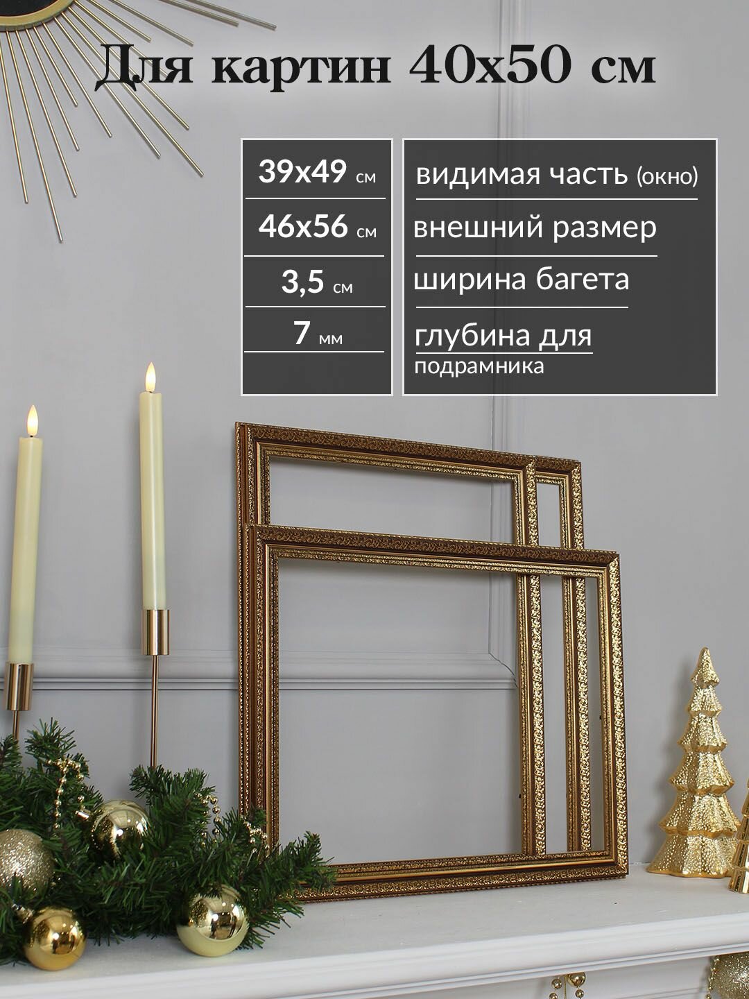 Три рамки для картин размером 40х50 см. Багетная рама от «Галерея РА» – это идеальное решение для оформления картин по номерам, алмазной мозаики, вышивки бисером, рисунков на бумаге, постеров, фотографий и других творческих изображений. Эти модели багета выполнены из полистирола и имеют классический дизайн и декоративные узоры, что позволяет придать вашему интерьеру особый шарм и уют. Габаритный размер фоторамки составляет 46х56 см, ширина профиля – 3,5 см. Видимая часть изображения в раме – «окно» имеет размер 39 на 49 см, а глубина четверти для подрамника – 7 мм.