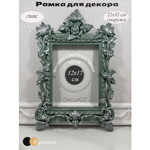 Рамка для декора из высокопрочного гипса, окрашена стойкими красками. Размер внешний 22х32, внутренний 12х17 см. Подойдет для оформления вышивки, панно, зеркал, постеров, фото. Без стекла и картонного задника. Проволочные крепления на обратной стороне (ушки) позволяют повесить на стене вертикально, горизонтально и закрепить фото.