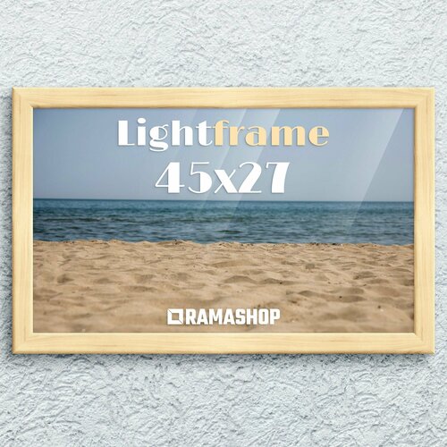 Рама багетная Light Frame, 45 х 27 см Внутренний размер Рамы: 45.3 см х 27.3 см Внешний размер рамы: 48.7 см х 30.7 см Материал рамы: Карельская сосна Профиль: 24 х 16 мм, скругленный Материал задника: гофрокартон т-24, 3.2 мм Стекло: ПЭТ вкладыш 0.3 мм с защитной пленкой