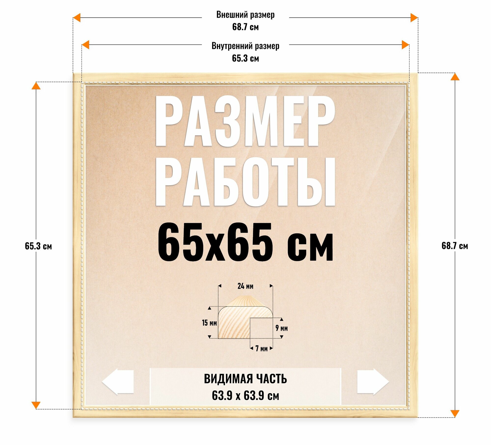 Рама багетная Light Frame, 65 х 65 см Внутренний размер Рамы: 65.3 см х 65.3 см Внешний размер рамы: 68.7 см х 68.7 см Материал рамы: Карельская сосна Профиль: 24 х 16 мм, скругленный Материал задника: гофрокартон т-24, 3.2 мм Стекло: ПЭТ вкладыш 0.3 мм с защитной пленкой