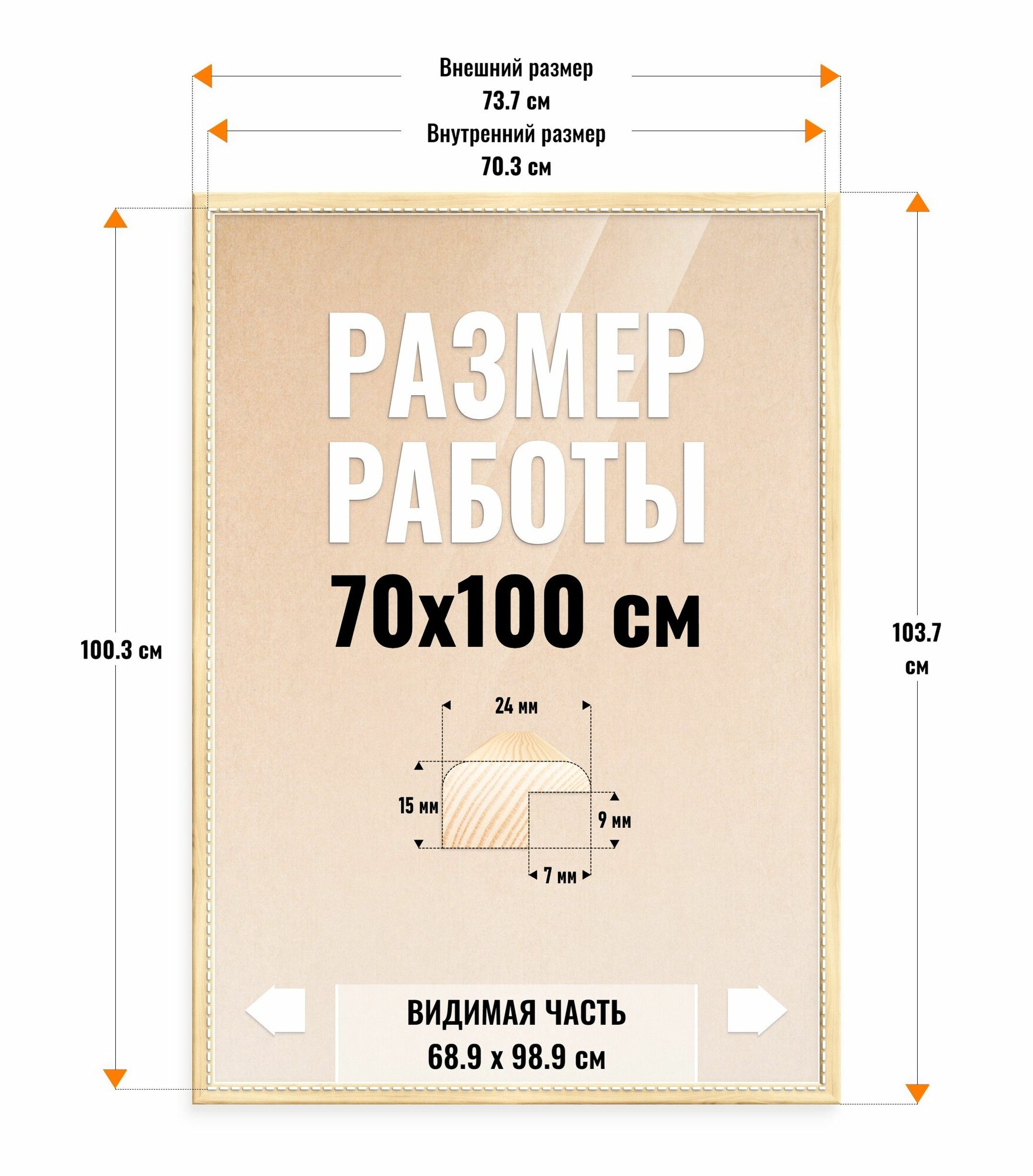Рама багетная Light Frame, 70 х 100 см Внутренний размер Рамы: 70.3 см х 100.3 см Внешний размер рамы: 73.7 см х 103.7 см Материал рамы: Карельская сосна Профиль: 24 х 16 мм, скругленный Материал задника: гофрокартон т-24, 3.2 мм Стекло: ПЭТ вкладыш 0.3 мм с защитной пленкой