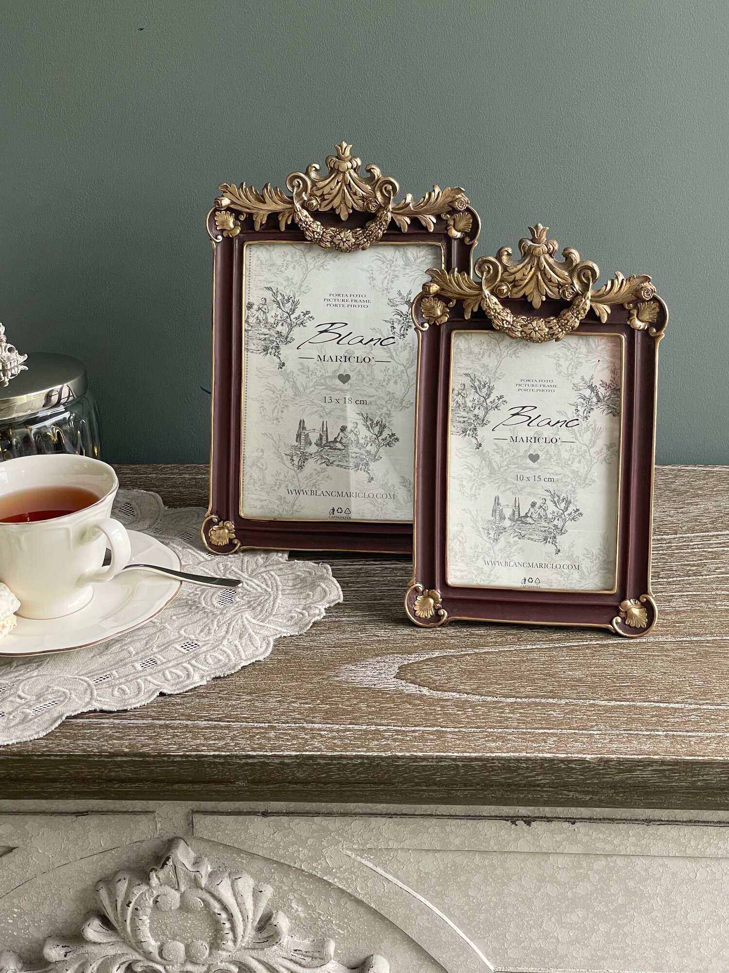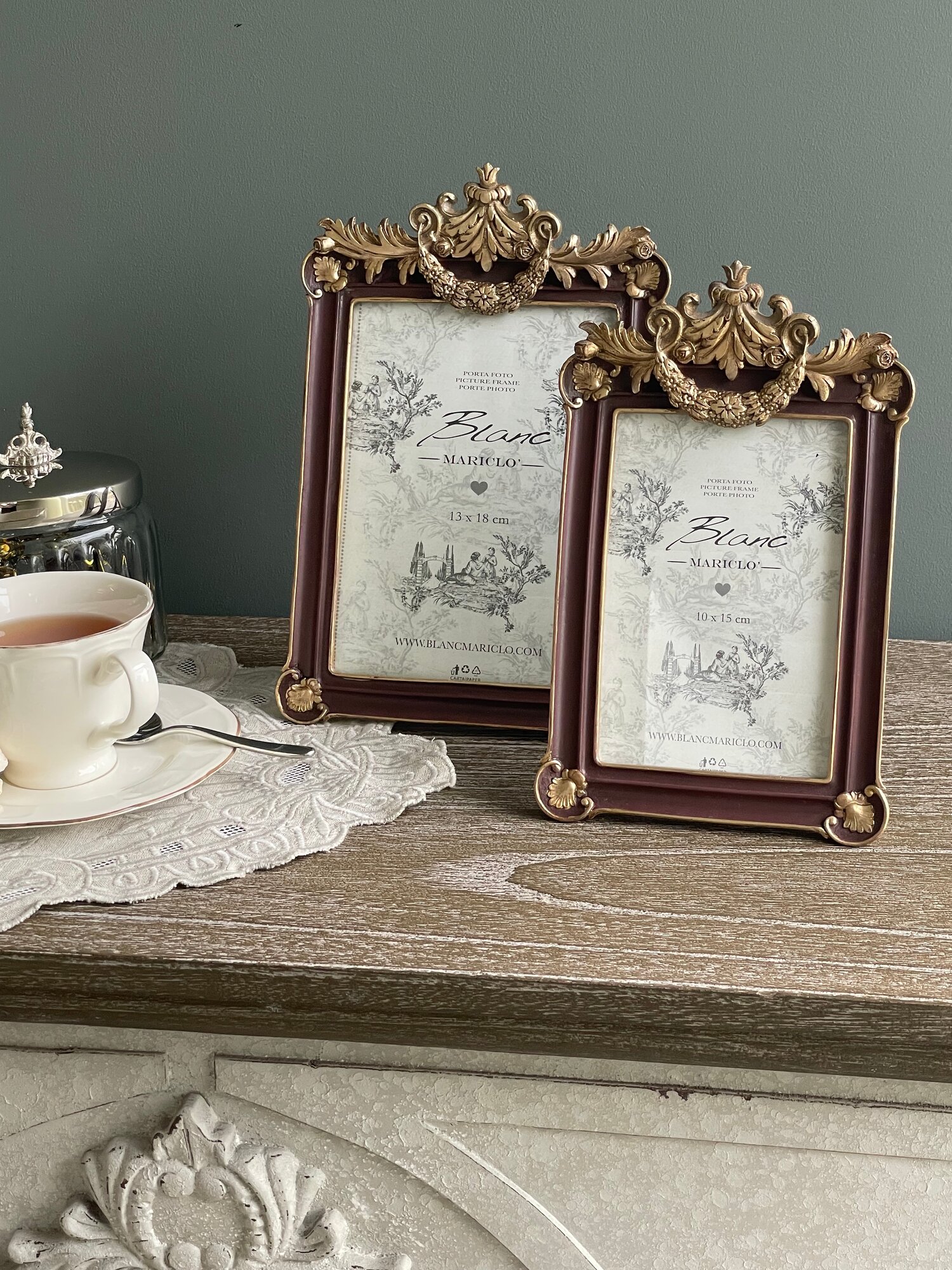 Рамка для фотографии VILLA CLARA торгового дома Blanc Mariclo - это идеальный выбор для тех, кто ищет элегантное и стильное обрамление для своих любимых фотографий. Настольная рамка выполнена из полимерной смолы, в бордовом цвете и теплой позолотой с легким налетом старины.