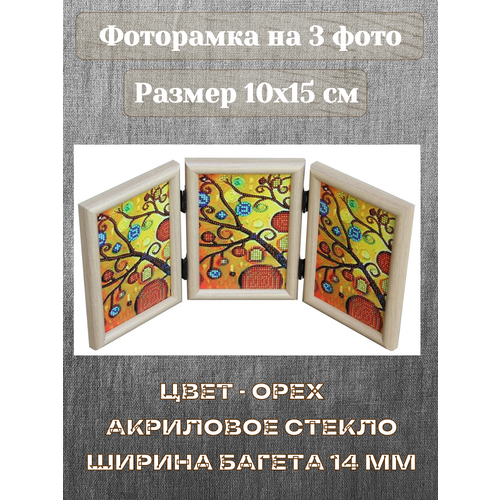 Рамка тройная вертикальная 10х15 см Орех багет 385 состоит из трёх рамок формата 10х15 см, соединённых собой металлическими петлями. Размер видимой части 9,2х14,2 см. Это надо учитывать при вставке фотографий. Ширина багета 16 мм. Задники рамки изготовлены из оргалита, в рамку поставлено акриловое, небьющееся стекло. Фотографии в рамке расположены вертикально. Кроме рамок формата 10х15 см предлагаем рамки формата 15х21 см, в разных расцветках.