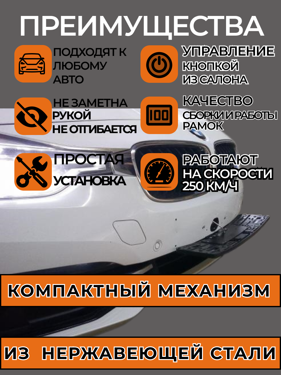Простота установки и использования В комплект входит кнопка с проводами, что делает установку рамки быстрой и удобной. Рамка открывается при скорости до 250 км/ч, что обеспечивает безопасность на дороге.