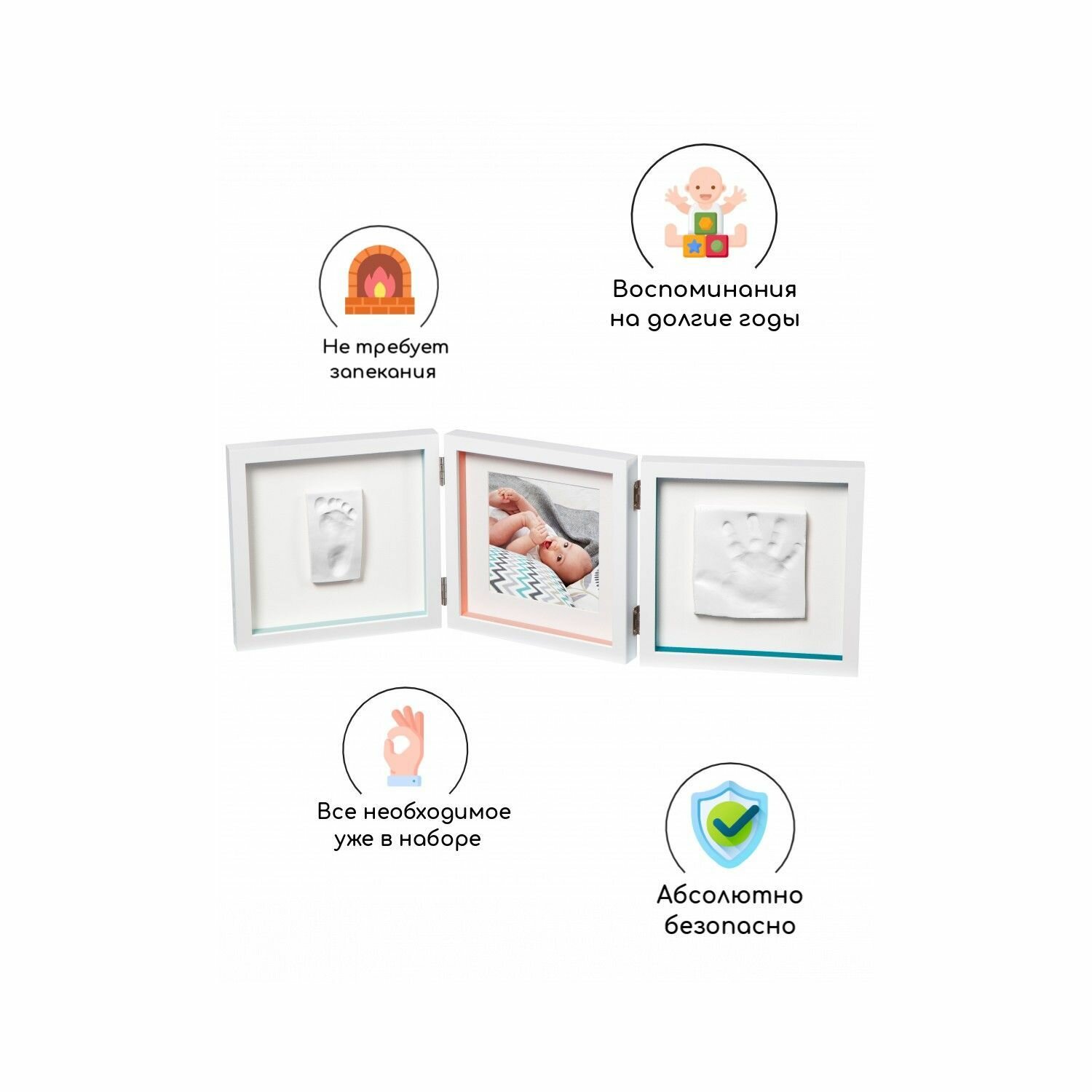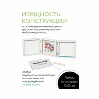 Особенностью рамочки является её функциональность - она предназначена для слепков. Это позволяет сохранить не только фотографии, но и отпечатки ручек и ножек малыша.