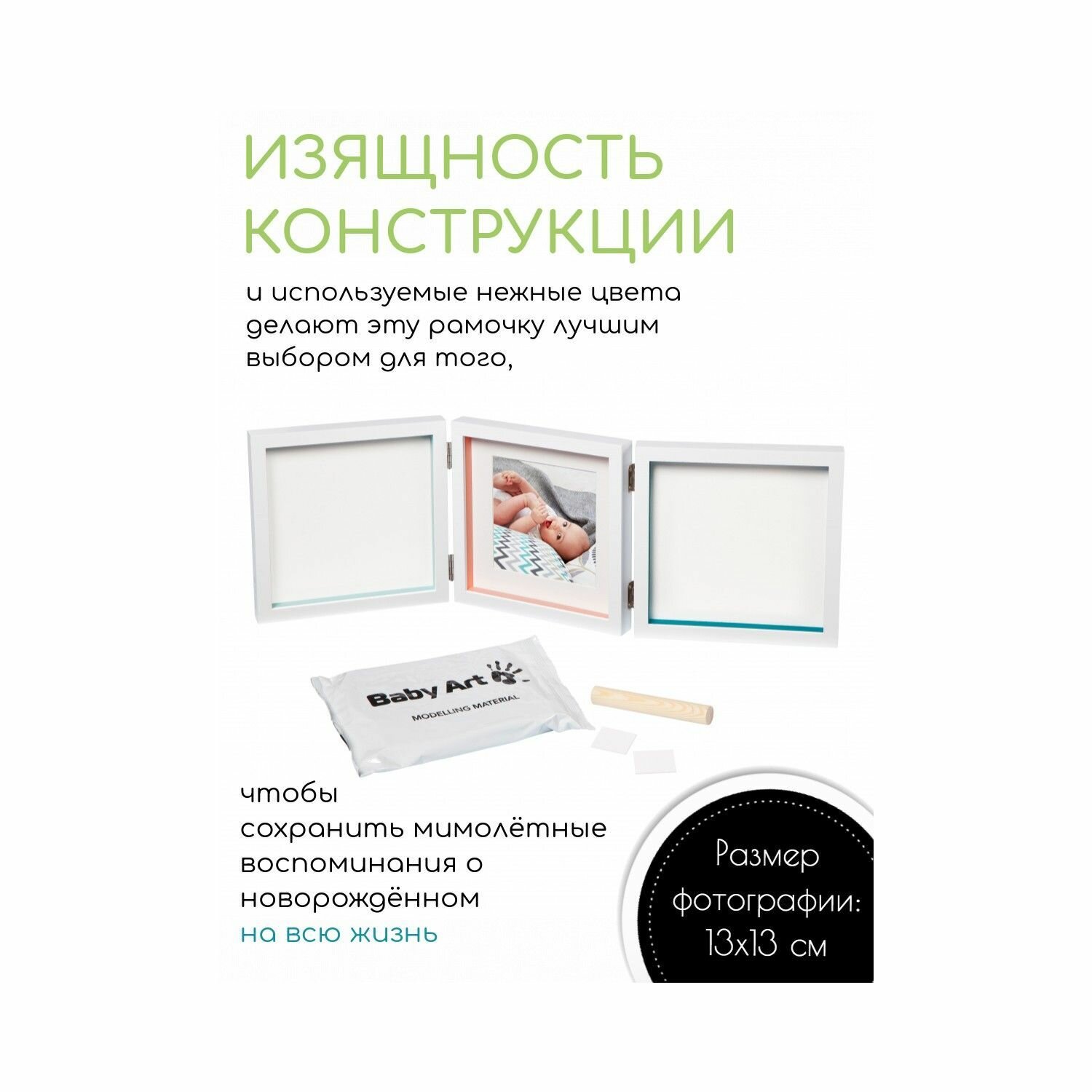 В комплект поставки входят: тройная рамка для фото и отпечатков, герметичный пакет с полимерной массой и брусок для раскатки массы. Размер фотографии составляет 13х13 см, что позволяет разместить на ней самые яркие и запоминающиеся моменты.
