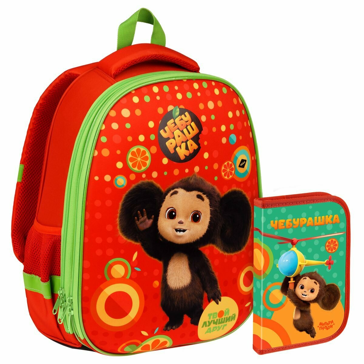 Купить Ранец школьный Мульти-Пульти «Чебурашка» 39x30x18см, 2 отделения, 2 кармана, анатомическая спинка, пенал, 4шт. (ЧБ_55144) с доставкой по всей России.