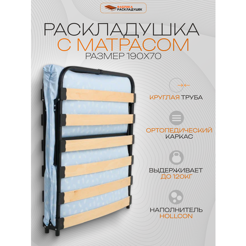 раскладушка с матрасом "Либра70" - современная модель складной кровати с ортопедическим основанием и матрасом из полужёсткого холкона, в чехле с фиксирующими лентами для фиксации к каркасу раскладушки, таким образом матрас надежно крепится и остаётся на своём месте. Материал основания раскладушки "Либра70" - деревянные ламели с матрасом в комплекте. Раскладушка "Либра70" легко складывается и раскладывается. Занимает минимум места в сложенном состоянии, а размер спального места 190*70*45 см позволит хорошо расслабиться и отдохнуть. Диаметр трубы - 25 мм с круглым сечением. Допустимая нагрузка на раскладную кровать "Либра70" до 120 кг. Матрас 7 см плотностью 1500 гр/м
