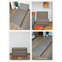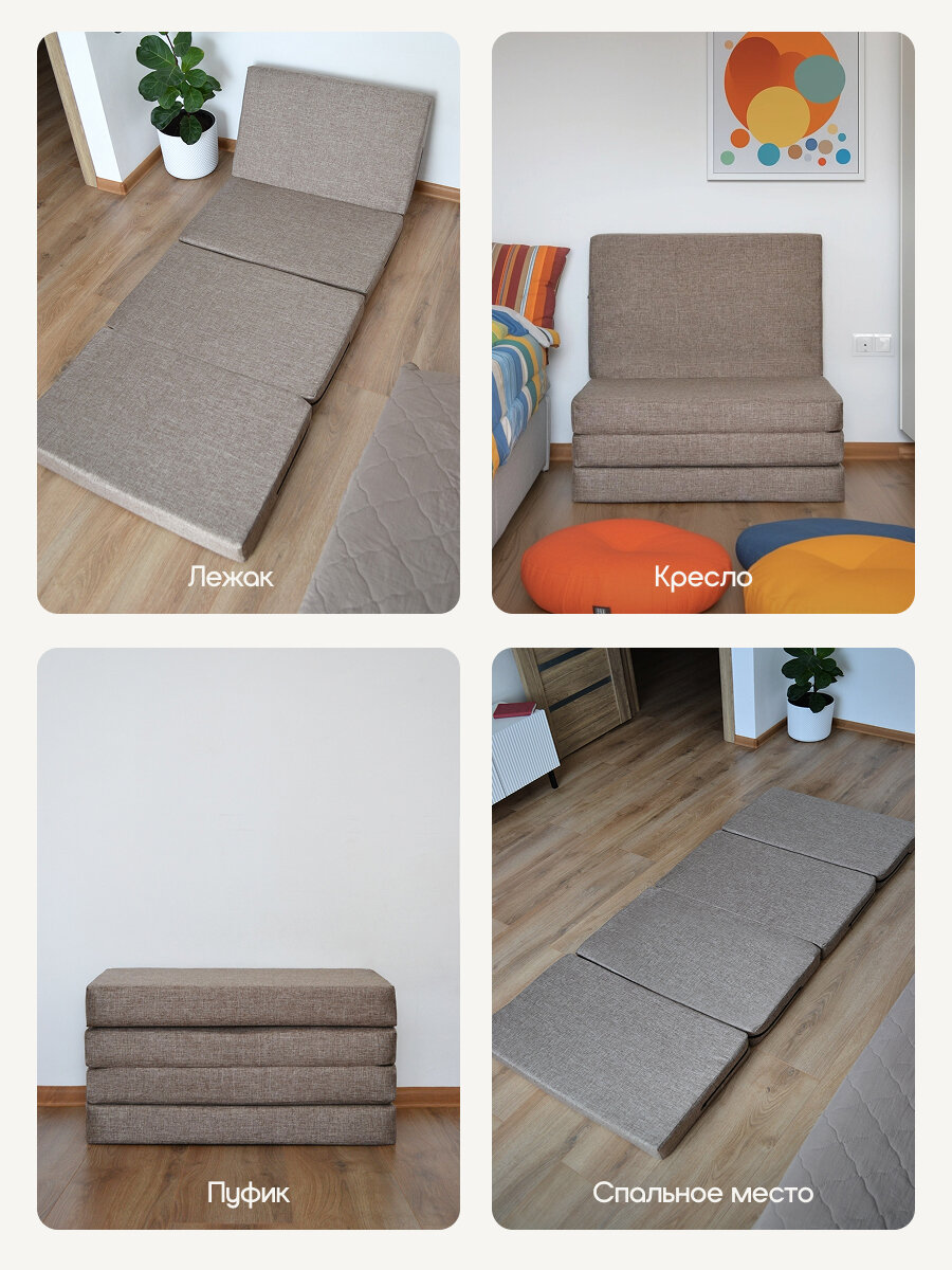 Преимущества: Многофункциональность: пуф, кресло, шезлонг, спальное место. Компактность: легко складывается и помещается в шкаф или под стол. Легкий уход: съемный чехол можно стирать в стиральной машине. Универсальность: подходит для любого интерьера — гостиной, спальни, детской, балкона или прихожей.