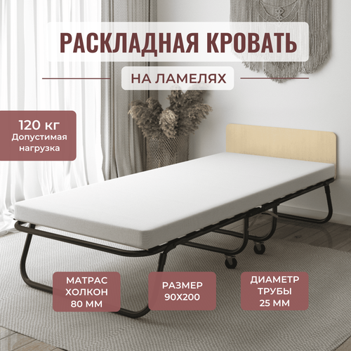В разложенном состоянии имеет размеры полноценной односпальной кровати (ДхШхВ) 2000*900*340 мм. Размеры раскладушки в сложенном состоянии 910*910*340 мм. В комплект входят каркас раскладушки с подголовником, матрас. Материалы, из которых изготовлена раскладушка: • каркас - стальная труба 25х25 мм, толщиной 1мм, покрытая черной полиэфирной порошковой краской, • основание под матрас – березовые ламели размером 80х35х8 мм с пластиковыми латодержателями, • изголовье – ламинированное ДСП, цвет венге, • чехол для матраса – ткань микрофайбер, дополнительно с внутренней стороны простеган с синтепоном, на «молнии». • наполнитель матраса – Hollcon (холкон). Это нетканный материал на основе полиэфирных волокон, скрепленных под действие температуры, без применения клея. Поэтому является гипоаллергенным. Быстро восстанавливает форму после нагрузки. Толщина матраса 80 мм. Максимальная допустимая нагрузка на раскладушку (включая вес человека, матраса, подушки, одеяла, постельного белья) 120 кг. Для удобства перемещения в помещении раскладной кровати установлены 4 (четыре) колеса. Вес раскладушки 18,8 кг. Для фиксации в сложенном виде прилагается лента-контакт (липучка). Внимание! Перед эксплуатацией требуется сборка: необходимо установить изголовье, колесики и стяжки. Мы продаем раскладушки собственного производства.