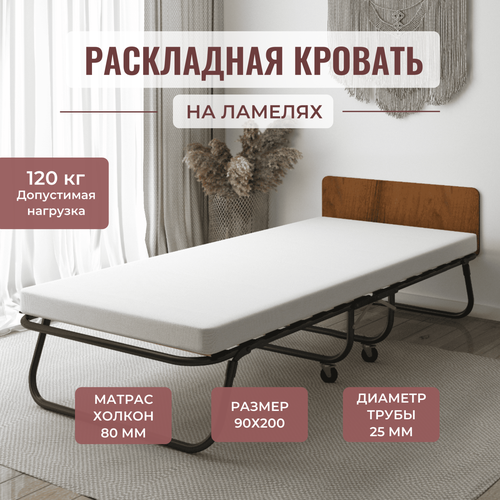 В разложенном состоянии имеет размеры полноценной односпальной кровати (ДхШхВ) 2000*900*340 мм. Размеры раскладушки в сложенном состоянии 910*910*340 мм. В комплект входят каркас раскладушки с подголовником, матрас. Материалы, из которых изготовлена раскладушка: • каркас - стальная труба 25х25 мм, толщиной 1мм, покрытая черной полиэфирной порошковой краской, • основание под матрас – березовые ламели размером 80х35х8 мм с пластиковыми латодержателями, • изголовье – ламинированное ДСП, цвет венге, • чехол для матраса – ткань микрофайбер, дополнительно с внутренней стороны простеган с синтепоном, на «молнии». • наполнитель матраса – Hollcon (холкон). Это нетканный материал на основе полиэфирных волокон, скрепленных под действие температуры, без применения клея. Поэтому является гипоаллергенным. Быстро восстанавливает форму после нагрузки. Толщина матраса 80 мм. Максимальная допустимая нагрузка на раскладушку (включая вес человека, матраса, подушки, одеяла, постельного белья) 120 кг. Для удобства перемещения в помещении раскладной кровати установлены 4 (четыре) колеса. Вес раскладушки 18,8 кг. Для фиксации в сложенном виде прилагается лента-контакт (липучка). Внимание! Перед эксплуатацией требуется сборка: необходимо установить изголовье, колесики и стяжки. Мы продаем раскладушки собственного производства.
