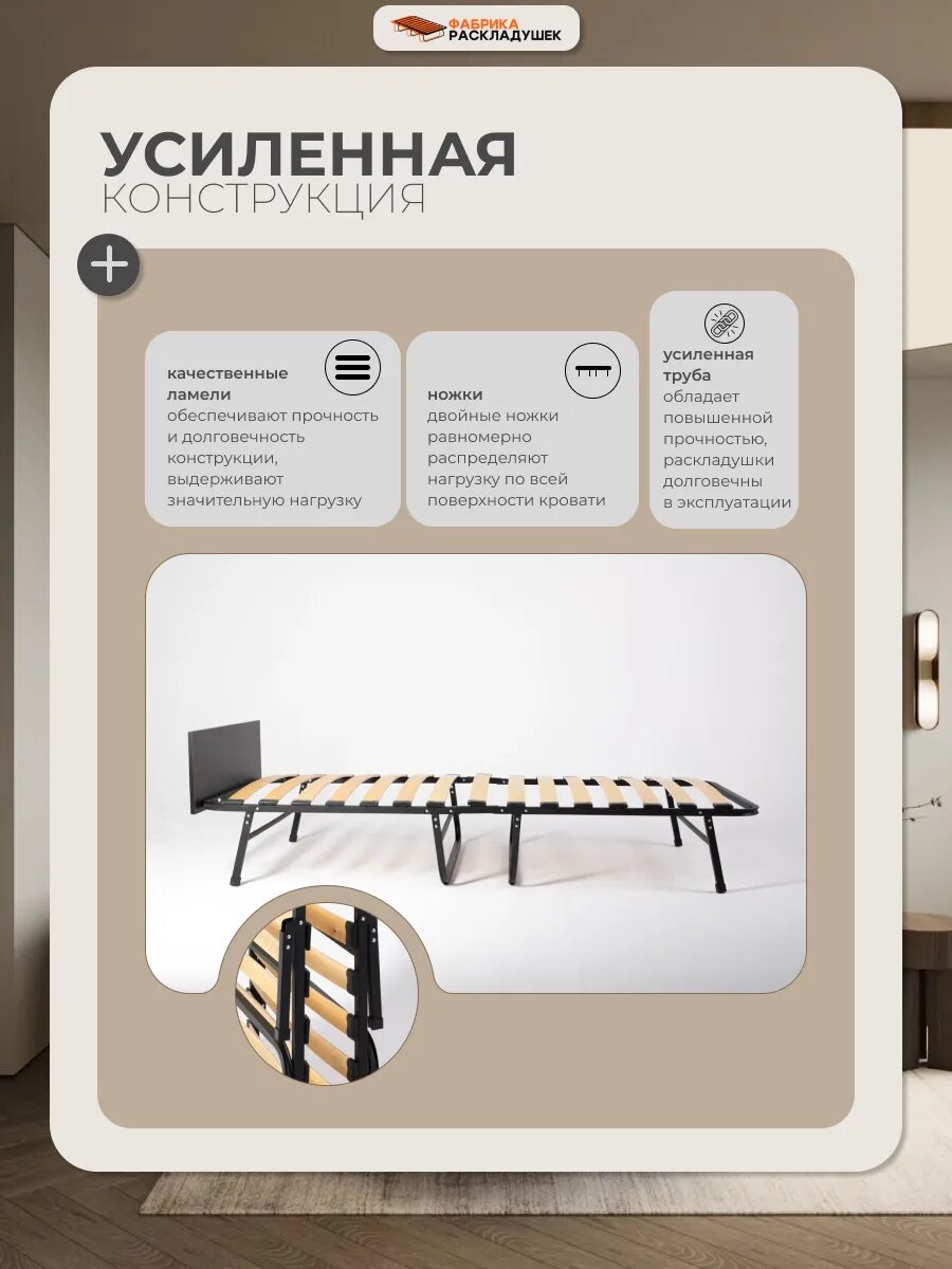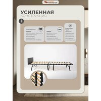Матрас размером 205х80 см с наполнителем из холкона и чехлом из тика обеспечивает дополнительный комфорт и долговечность. Деревянное изголовье и усиленная конструкция каркаса гарантируют стабильность и надежность раскладушки.