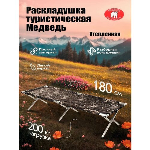 Раскладушка туристическая Медведь Утепленная это идеальный выбор для тех, кто ценит комфорт и удобство во время отдыха или путешествий. Взрослая раскладушка - просто находка для любителей туризма, кемпинга или просто отдыха на природе с семьей. Также это лучший вариант для зимней рыбалки, раскладушка трансформер прекрасно помещается в палатке Куб, а также, как показала практика, компактная раскладушка отлично подходит для квартиры или дома благодаря небольшому весу в 6 кг и складному механизму. На процесс разборки-сборки уходит всего пара минут, бюджетная раскладушка отлично подойдет для сна, размещении гостей, поставляется без матраса. В комплекте также поставляется чехол из прочной ткани Oxford, который облегчает транспортировку. Раскладушка Медведь имеет размер 180 х 65 х 40 см - это шире и выше стандартного размера, способна выдержать 200 кг статической нагрузки. Изготовлена с расчетом на долгий срок службы, ремонтопригодность так как выполнена на оцинкованных винтах и гайках. Крепления между каркасом изготовлено лазерной резкой из стали толщиной 2 мм, полностью оцинкованы и не подвержены коррозии. Для крепления частей конструкции используются оцинкованные винты, которые можно заменить. Фиксаторы (втулки), крепящие перекладины, сделаны из высокопрочного инженерного полимера. Толщина профилированной алюминиевой трубки 1,5 мм. Текстильное полотно сделано на оборудовании высокого уровня из смесовой ткани грета, имеющий дизайн в стиле камуфляжа и утеплено несколькими слоями синтепона, имеет качественные ровные швы. У данной раскладушки небольшие габариты в собранном виде, а именно: высота 85 см, ширина 25 см, глубина 25 см. Кровать для кемпинга Медведь произведена в России, г. Екатеринбург.