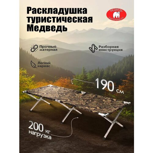 Раскладушка туристическая Медведь это идеальный выбор для тех, кто ценит комфорт и удобство во время отдыха или путешествий. Взрослая раскладушка - просто находка для любителей туризма, кемпинга или просто отдыха на природе с семьей. Также это лучший вариант для зимней рыбалки, раскладушка трансформер прекрасно помещается в палатке Куб, а также, как показала практика, компактная раскладушка отлично подходит для квартиры или дома благодаря небольшому весу в 5 кг и складному механизму. На процесс разборки-сборки уходит всего пара минут, бюджетная раскладушка отлично подойдет для сна, размещении гостей, поставляется без матраса. В комплекте также поставляется чехол из прочной ткани Oxford, который облегчает транспортировку. Раскладушка Медведь имеет размер 190 х 65 х 40 см - это шире и выше стандартного размера, способна выдержать 200 кг статической нагрузки. Изготовлена с расчетом на долгий срок службы, ремонтопригодность так как выполнена на оцинкованных винтах и гайках. Крепления между каркасом изготовлено лазерной резкой из стали толщиной 2 мм, полностью оцинкованы и не подвержены коррозии. Для крепления частей конструкции используются оцинкованные винты, которые можно заменить. Фиксаторы (втулки), крепящие перекладины, сделаны из высокопрочного инженерного полимера. Толщина профилированной алюминиевой трубки 1,5 мм. Текстильное полотно сделано на оборудовании высокого уровня из смесовой ткани грета, имеющий дизайн в стиле камуфляжа и утеплено слоем синтепона, имеет качественные ровные швы. У данной раскладушки небольшие габариты в собранном виде, а именно: высота 90 см, ширина 20 см, глубина 20 см. Кровать для кемпинга Медведь произведена в России, г. Екатеринбург.