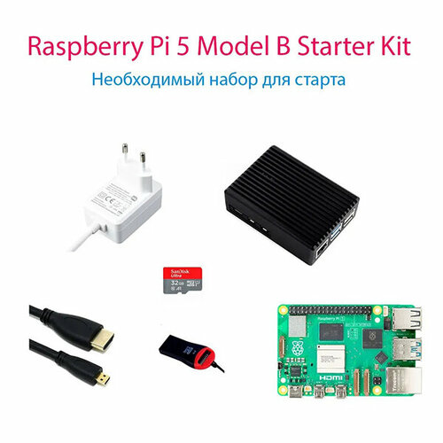 Микрокомпьютер Raspberry Pi 5 8Gb RAM; MicroSD 32 ГБ класса 10 A1 с предустановленной ОС Raspberry Pi; Кард-ридер USB 2.0 Micro SD/TF; Алюминиевый корпус для Raspberry Pi 5 с охлаждающим вентилятором и стойками радиатора Кабель micro-HDMI — HDMI Блок питания 27W USB Type-C для Raspberry Pi 5