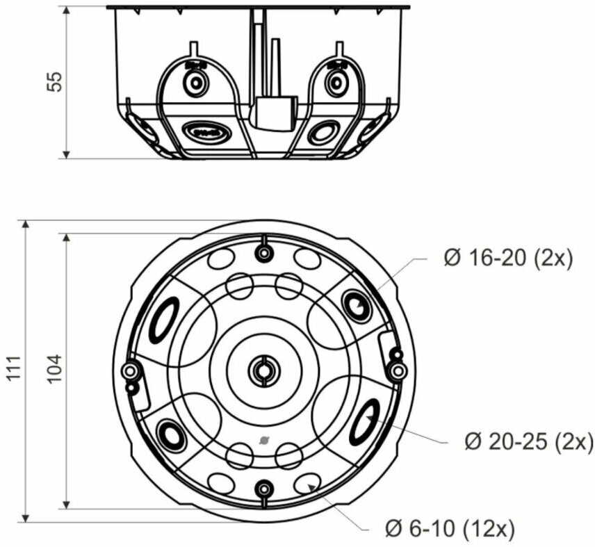 - Монтаж в гипсокартон. Удобная фиксация кабелей и труб через герметичные вводы. Пыль утеплителя/мин. ваты не попадает в помещение через щели подрозетника. Нет необходимости зенковать край гипсокартона при монтаже.