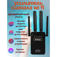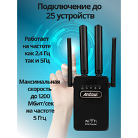 Наш двухдиапазонный расширитель WiFi — идеальное решение для устранения мертвых зон и обеспечения стабильного сигнала в вашем доме или офисе. Усилитель Wi-Fi сигнала 5g (экстендер, ретранслятор) — идеальное решение для устранения зон плохого приема Усилитель wifi сигнала - лучший способ увеличить мощность беспроводной сети вашего роутера и улучшить качество интернет соединения. Репитер wifi идеально подходит для расширения зоны покрытия до 150 квадратных метров. router wifi обеспечивает скорость до 1200 Мбит/сек на частоте 5 Ггц и поможет вдвое увеличить площадь, обслуживаемую вашей беспроводной сетью. Усилитель сигнала совместим с различными роутерами и поддерживает частотный сигнал 2,4 ГГц и 5 Ггц. Беспроводной вайфай усилитель связи оснащён четырьмя внешними антеннами, что обеспечивает надежную производительность и стабильный сигнал.