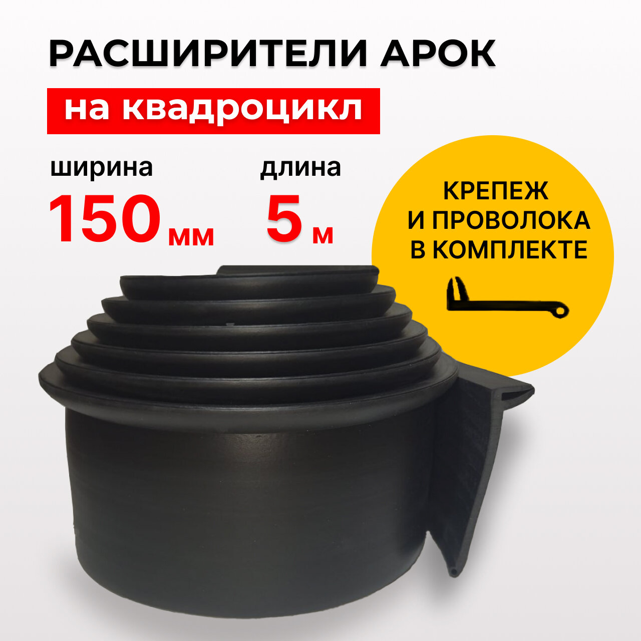 В комплекте: расширители арок - 5 метров, оцинкованная армирующая проволока - 5 метров и крепеж.
