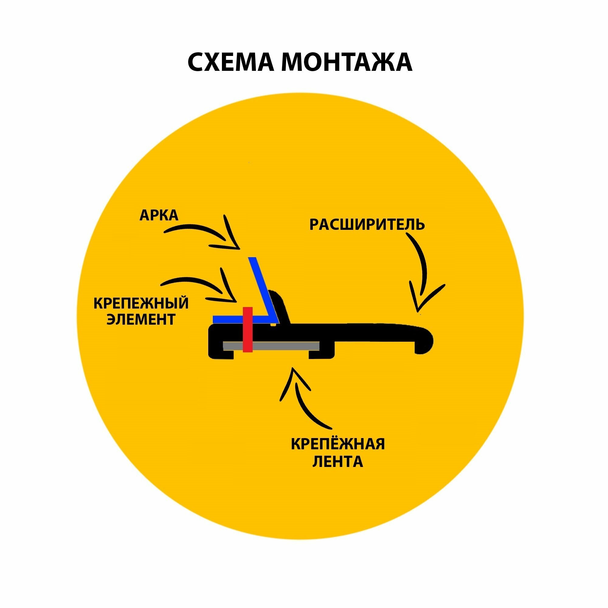 В комплект входят расширители арок черного цвета длиной 6 метров и шириной 23 мм (вылет от крыла), а также крепежная полоса длиной 6 метров.