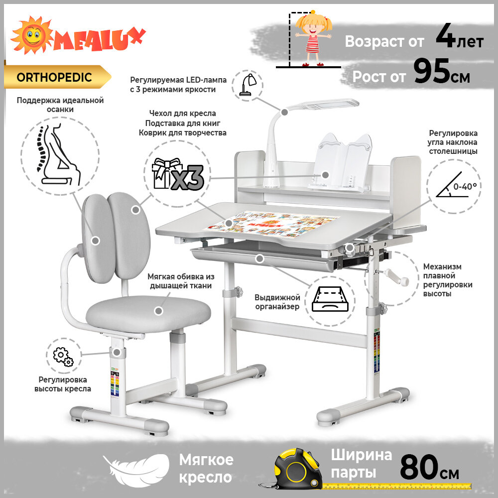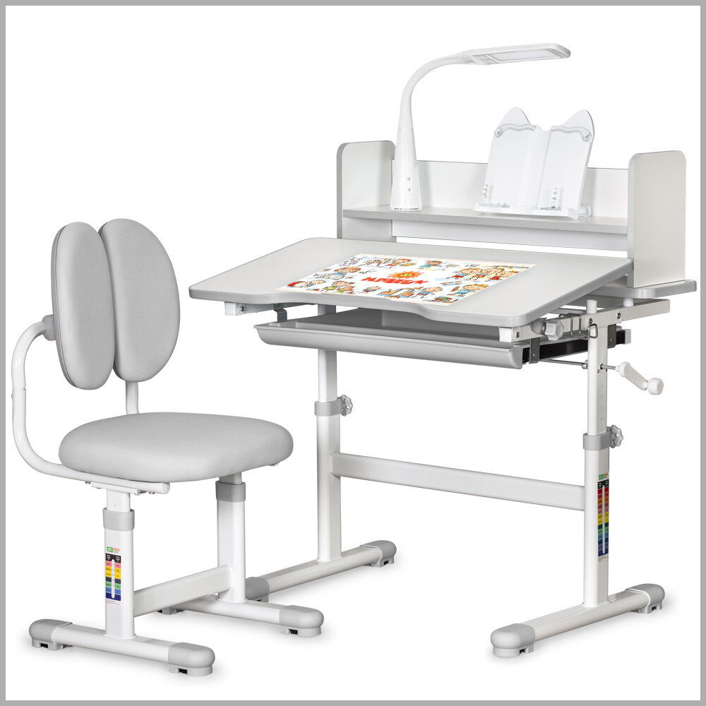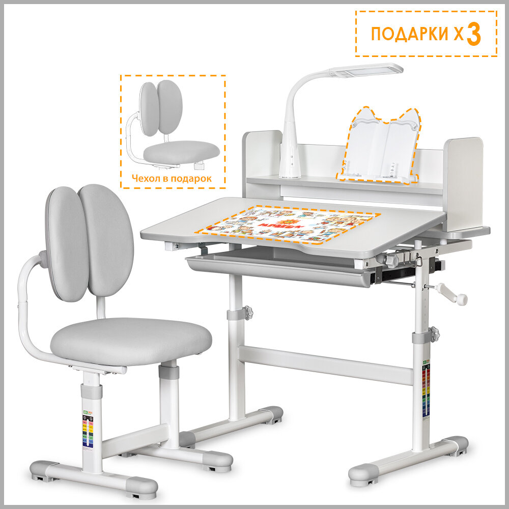 1.2. высота письменного стола для школьника регулируется ступенчато в диапазоне от 53 до 72 см, поэтому комплект подходит для детей от 3 до 12 лет. Шкала соотношения роста ребёнка к высоте столика поможет правильно подобрать параметры,