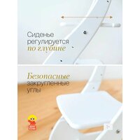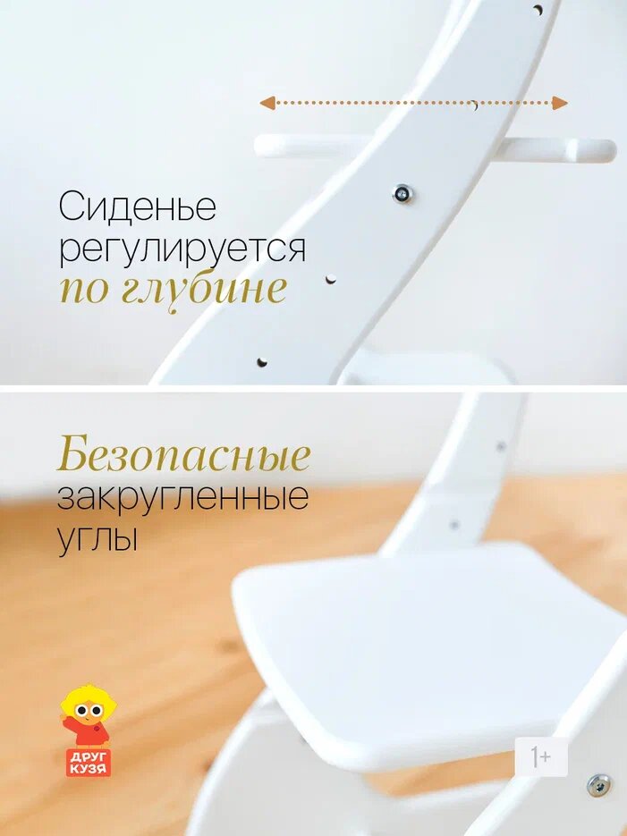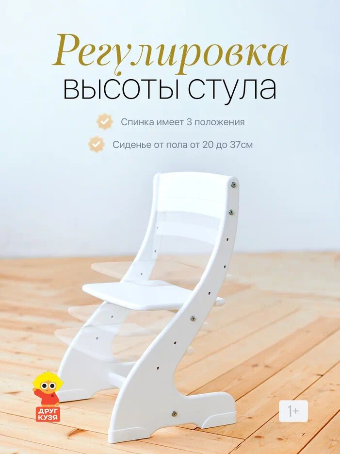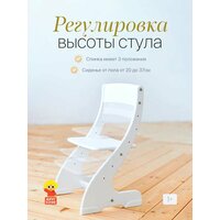 Регулируемый стул из дерева имеет 4 положения по высоте сиденья от пола, а также 3 положения спинки по высоте, сиденье настраивается по глубине. Настройте идеальное положение под рост вашего ребенка для сохранения правильной осанки с годика. Ножки стула защищены пластиковыми каблуками, поэтому изделие не боится влаги и легко перемещается по напольному покрытию, не оставляя царапин.