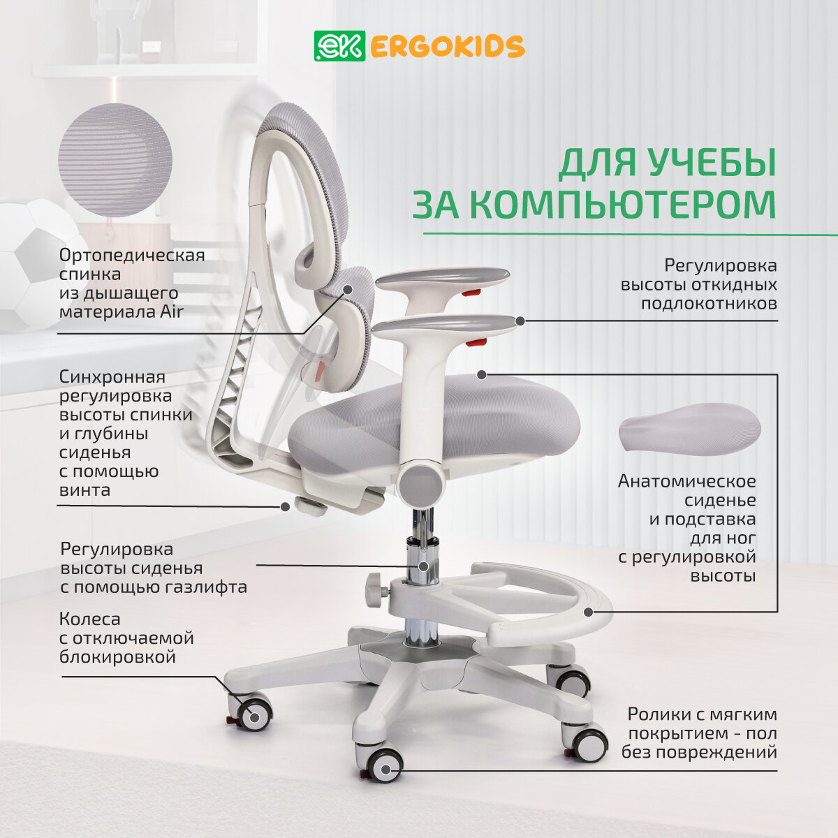 | Конструктивные особенности | с газлифтом, с колесами (роликами), с подлокотниками, с подставкой для ног, с поясничным упором |