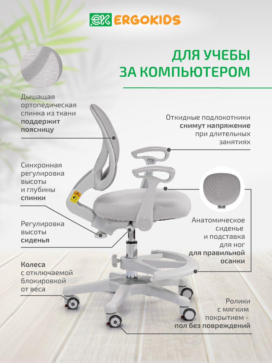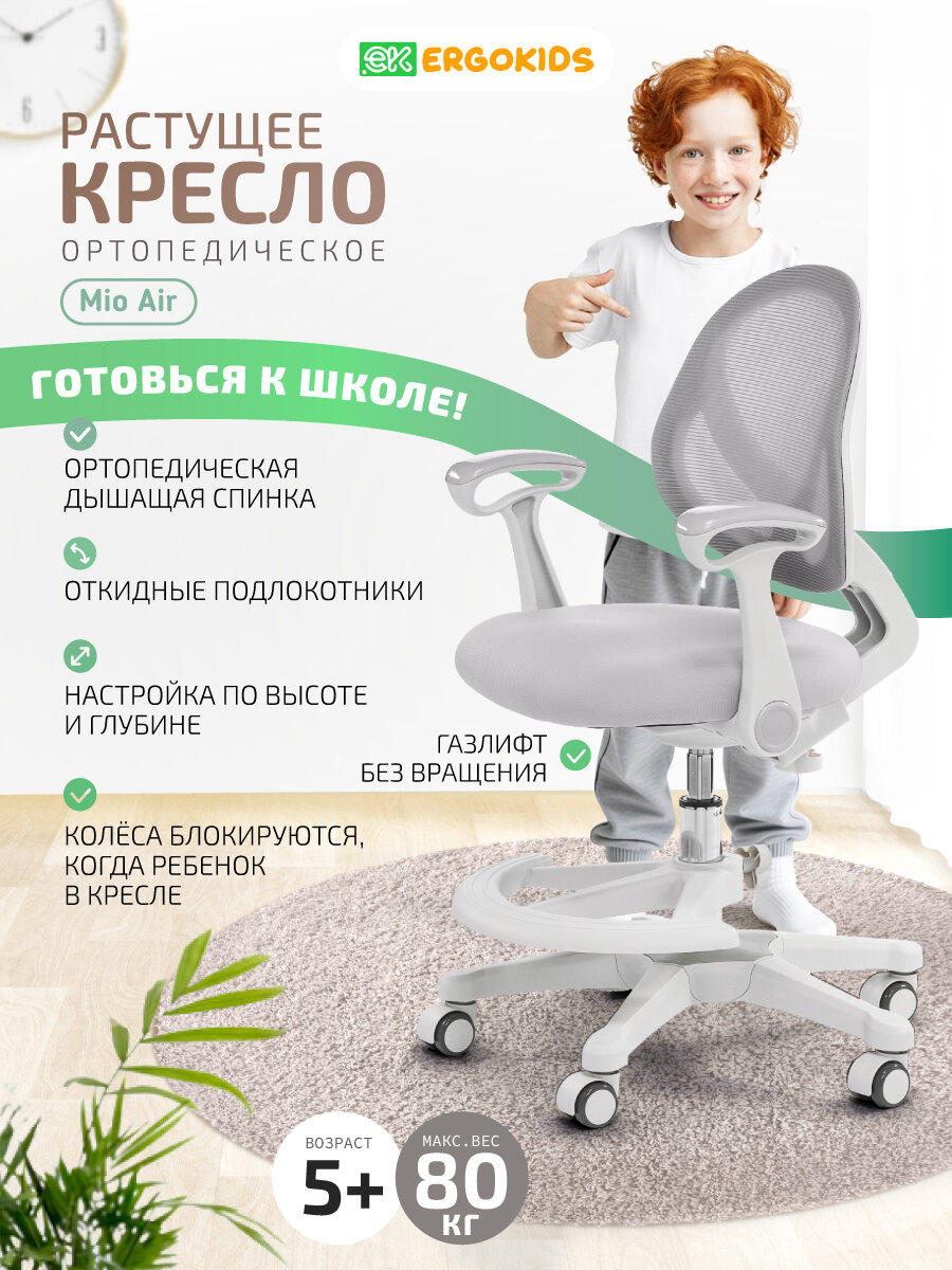 Детское компьютерное кресло Ergokids Mio Air (Y-400 ARM) – это ортопедическая мебель, которая заботится о здоровье спины вашего ребенка. Стул компьютерный для школьника подходит для простых письменных, компьютерных столов, растущих, обычных и складных парт и столиков. Максимальная высота рабочего стола до 77 см. Подходит для детей от 5 лет дошкольного возраста и школьникам (школьницам). Максимальный рост ребенка до 160 см.