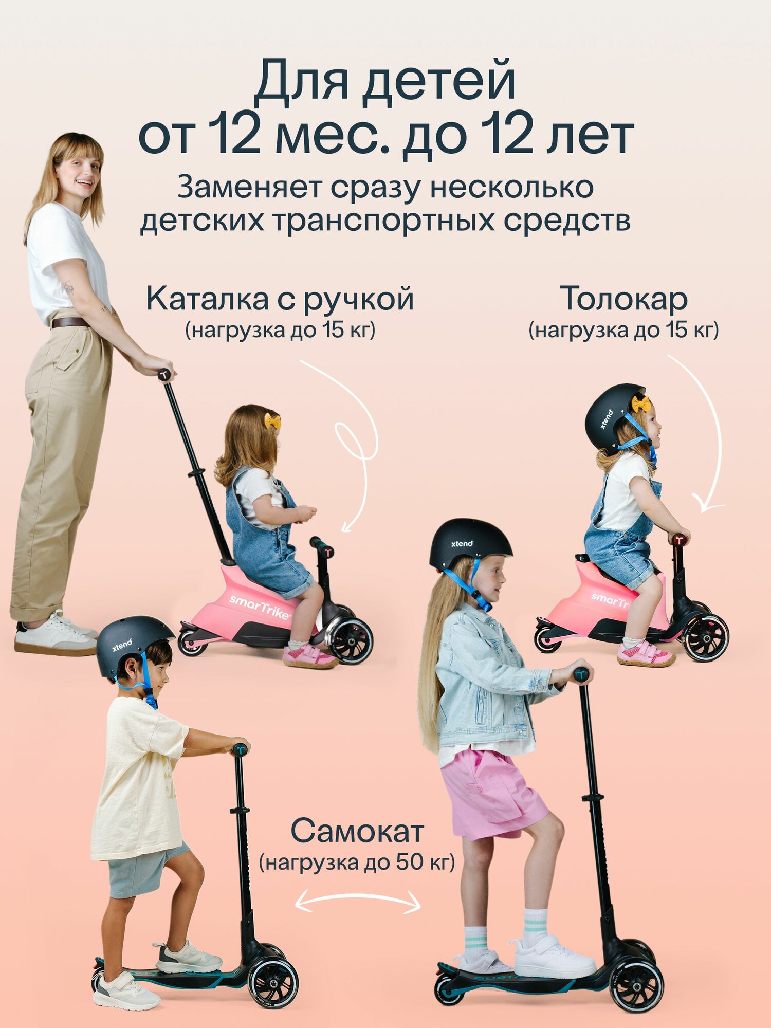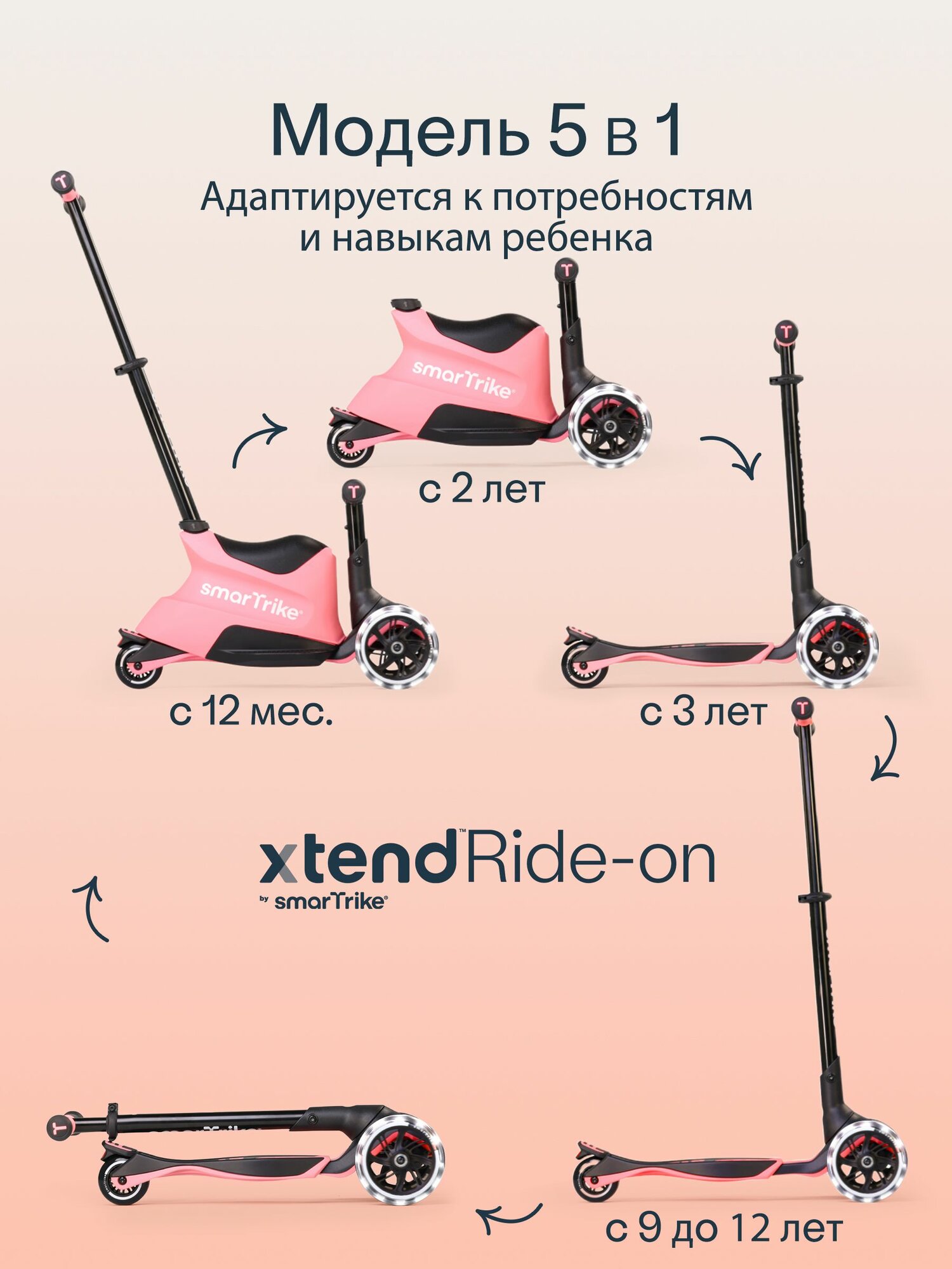 Растущий складной трехколесный самокат-трансформер 3в1 SmarTrike Xtend Ride-on с ручкой и сиденьем, Salmon Pink: сравнение цен, характеристики, фото, актуальное наличие и цены.