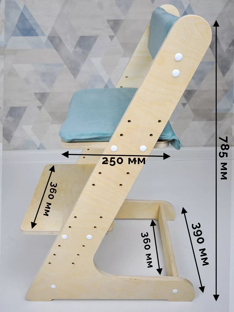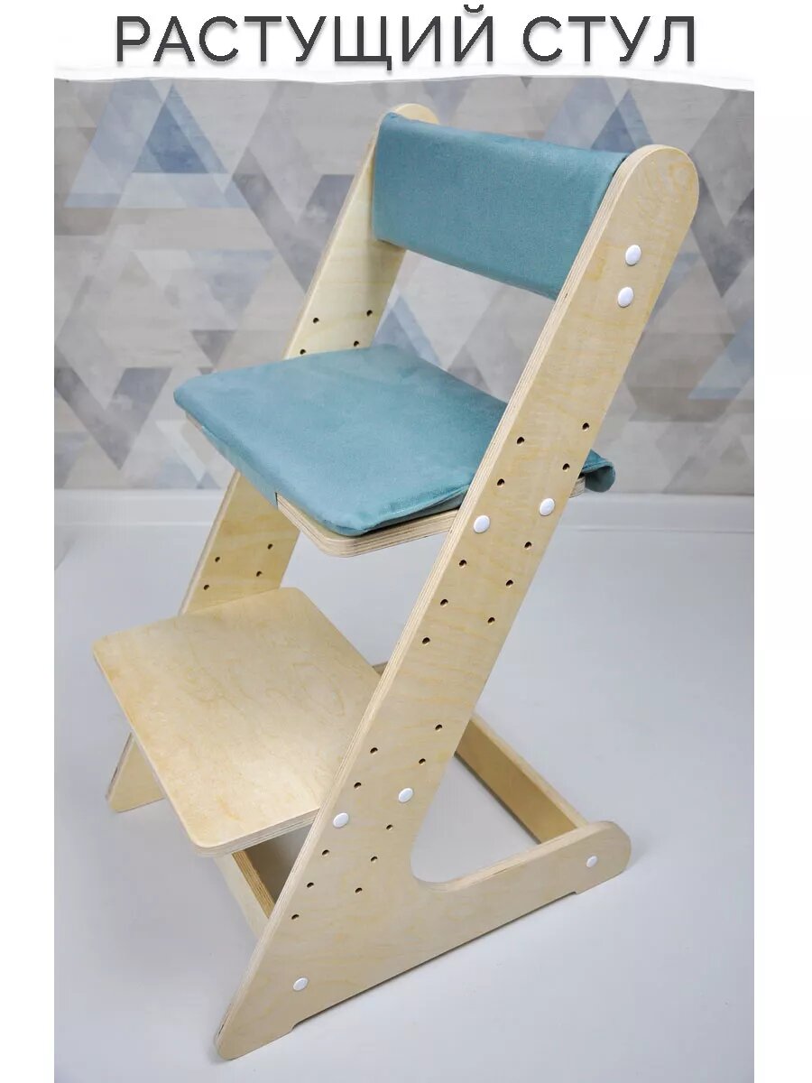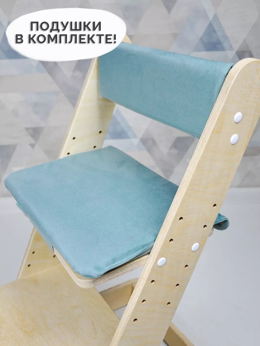 Растущий детский стул для правильной осанки вашего ребенка. Этот стул растет вместе с ребенком и позволяет ему сидеть за одним столом со взрослыми, что способствует формированию правильных привычек. Наш детский стул изготовлен из высококачественной березовой фанеры и предназначен для детей от 1 года. В комплекте нашего детского растущего стула идут удобные подушки для спинки и сиденья бирюзового цвета. Подушки выполнены из мягкого и приятного на ощупь велюра, а в качестве наполнителя используется высококачественный поролон. Эти подушки обеспечат вашему ребенку максимальный комфорт и поддержку во время сидения.