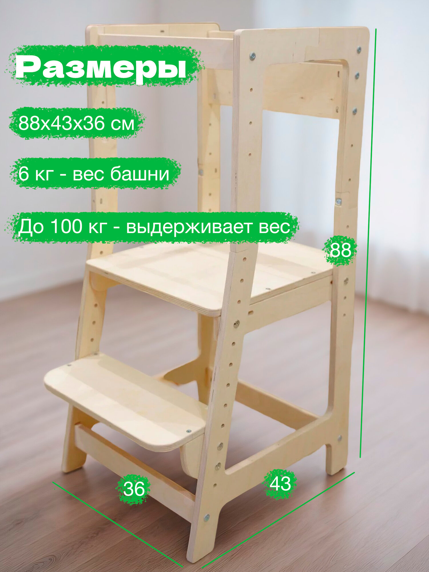 Регулируемый по высоте: адаптируется под рост ребенка – используется с 1 года до 6 лет. Экологичные материалы: башня помощница выполнена из натурального шлифованного дерева, безопасного для детей. Покрыта эмалью на водной основе. Эргономичный дизайн: Ступенька деревянная устойчива, имеет стильный внешний вид. Многофункциональность: растущий стул для кормления, удобная подставка детская или даже табуретка стремянка. Размеры: оптимальные для детской комнаты, кухни или игровой зоны. Дизайн: скандинавский стиль, подходит под любой интерьер. Стремянка деревянная сочетает стиль и практичность, вписываясь в интерьер любой детской комнаты.
