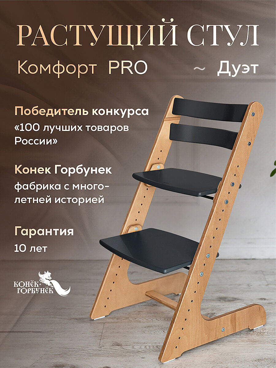 Растущий стул для детей Конек Горбунек – это вложение в здоровье вашего ребенка на долгие годы. Мы разработали детский стульчик, чтобы в нем регулировались сиденье и подставка для ног, позволяя использовать его под любой возраст, рост и комплекцию ребенка. Прекрасно подходит для кормления малыша в комплекте со столиком, ограничителем и другими аксессуарами. В детской комнате – это неотъемлемая часть ученической мебели трансформер для формирования правильной осанки. Регулируемая опора для ног и ортопедическая двойная изогнутая спинка поможет с профилактикой сколиоза для школьника во время выполнения уроков, рисования, чтения и других занятий за любым столом от 65 до 80 см. Ростовая модель Комфорт PRO имеет уникальную двойную спинку, которая поддерживает правильный анатомический изгиб позвоночника, а также расширенную гарантию в 10 лет. Данная серия имеет авторскую технологию фиксации элементов стула KG-FIX для большей устойчивости и нагрузки. Сборка и регулировка очень легкая, как у ikea, с ней справится даже ребенок. Современный скандинавский дизайн мебели вырастайка впишется в любой интерьер. Мебельная фабрика Конек Горбунок станет надежным помощником и другом для ваших детей. Вся наша продукция имеет сертификаты соответствия, покрыта краской на водной основе, безопасной для маленьких пользователей. Растущий стул для детей - полезный подарок на первое сентября, день рождения или по любому другому поводу!