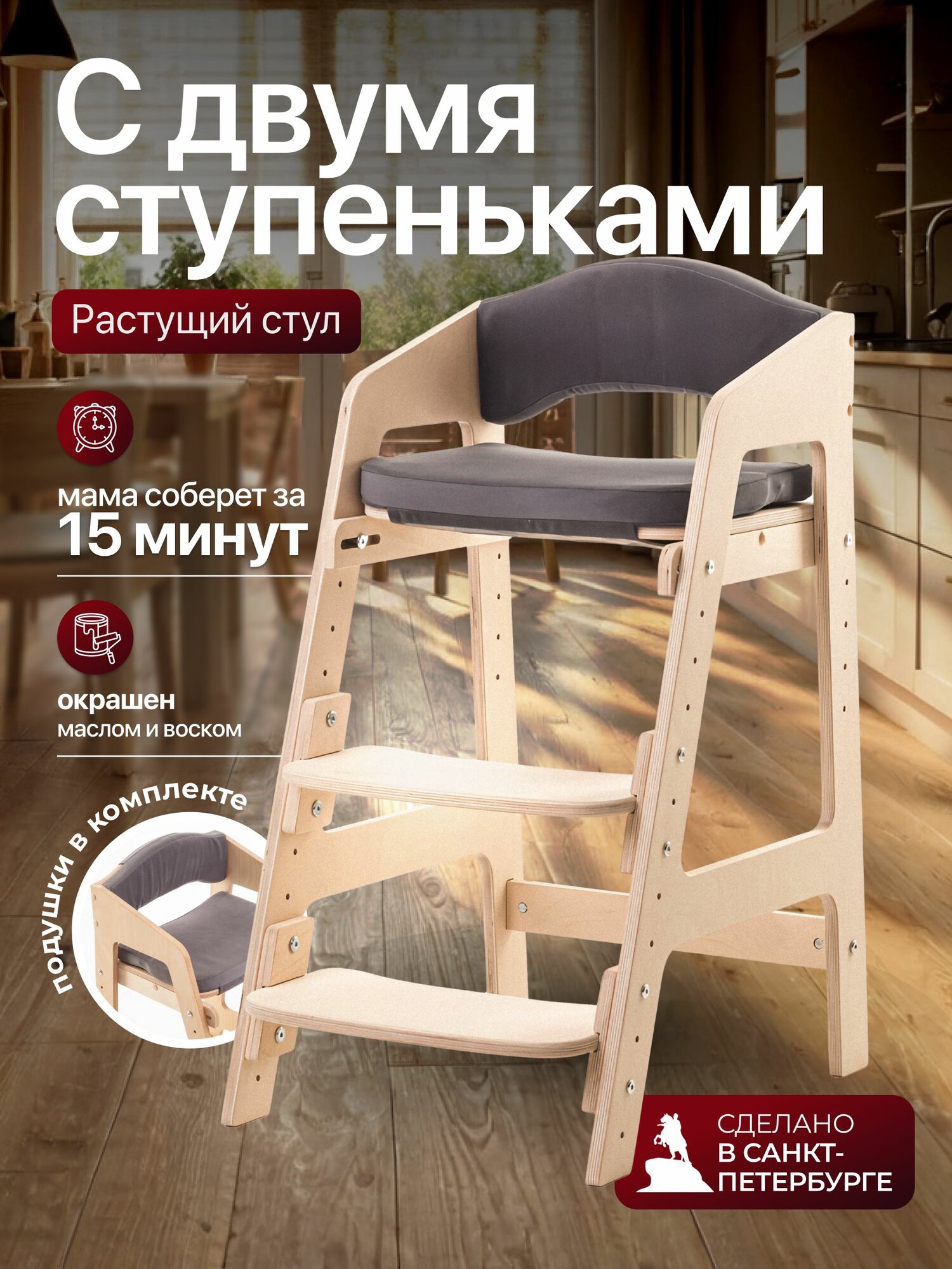 Купить Растущий стул движение-жизнь, для детей, деревянный, с подушками с доставкой по всей России.