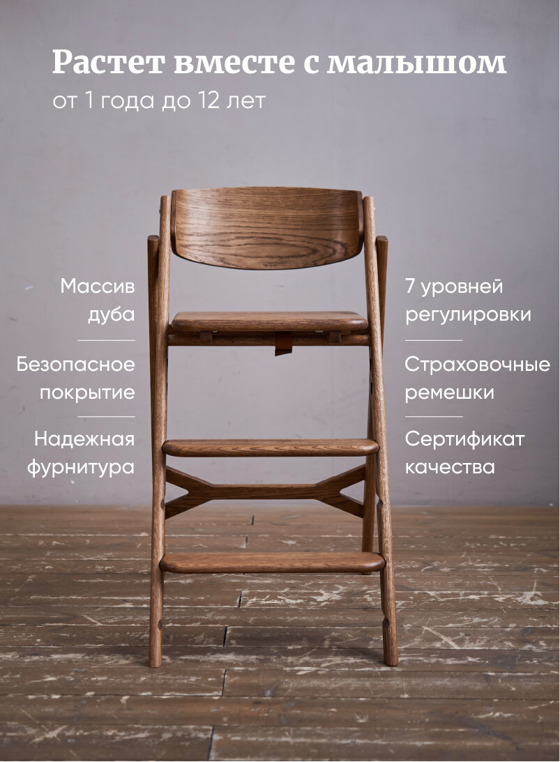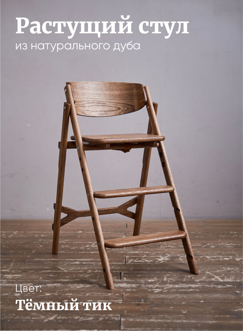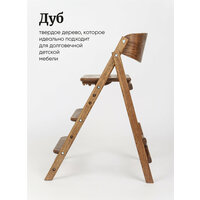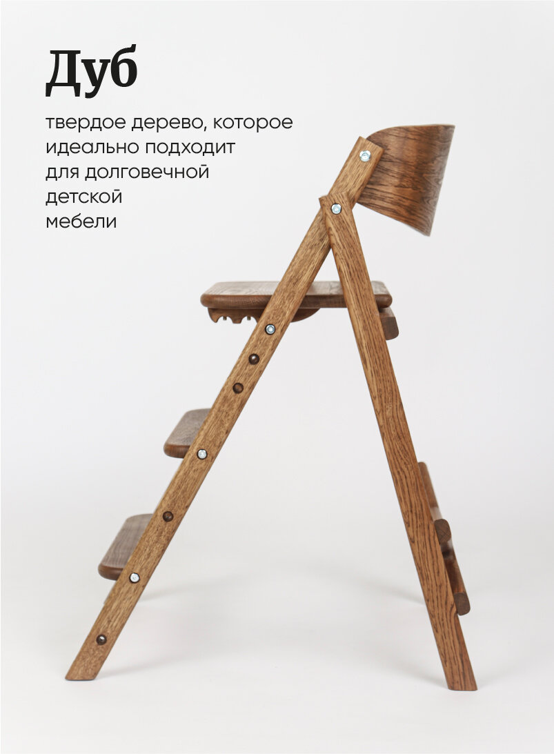 Растущий стульчик выполнен из массива дуба, а покрыт специальным масло для детской мебели Biofa. Благодаря складной конструкции стульчик занимает совсем мало места.