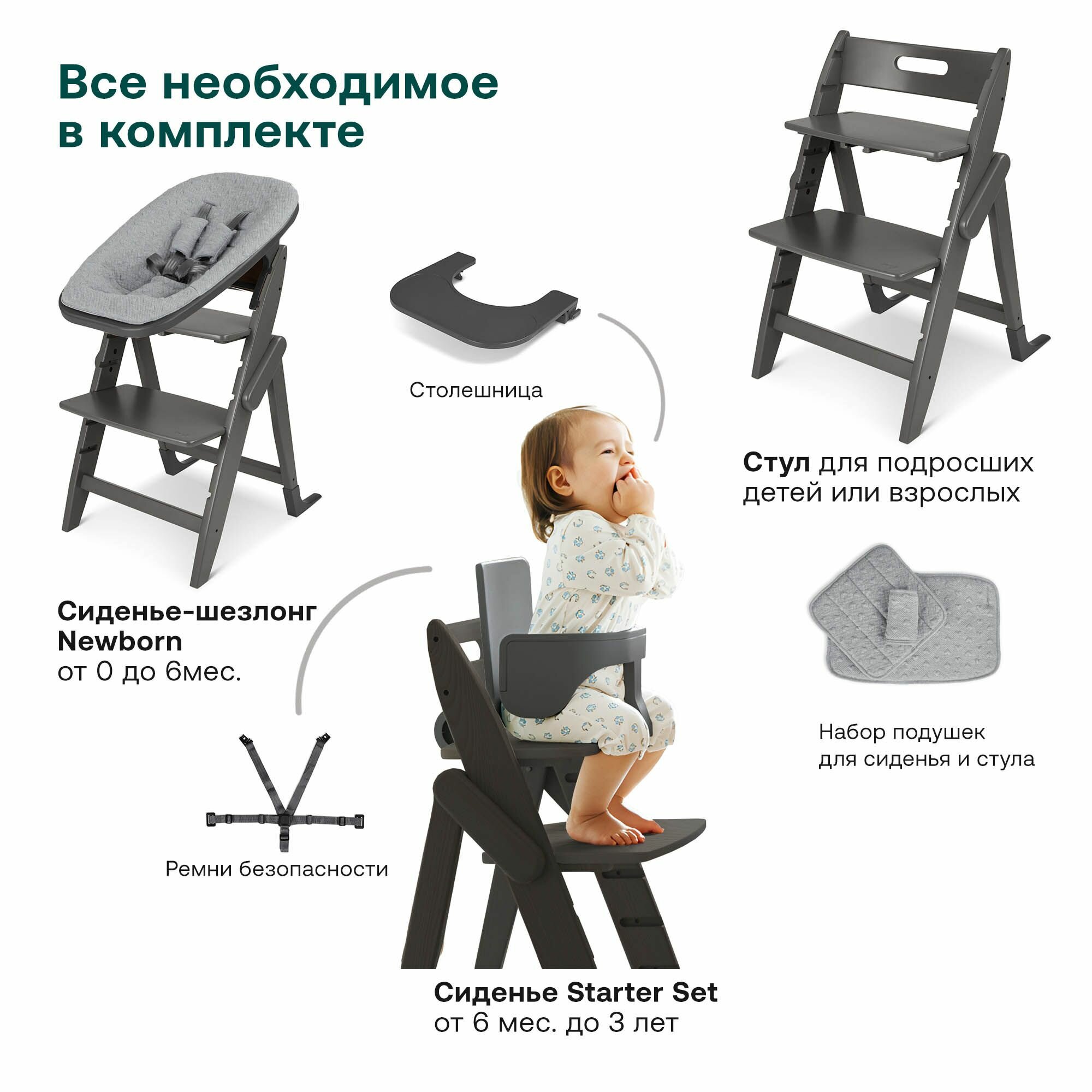 С 6 месяцев. Для тех, кто уверенно держит спинку. Starter Set — специально сиденье-бустер, сочетается с пятиточечными ремнями, столешницей и набором мягким текстильных подушечек