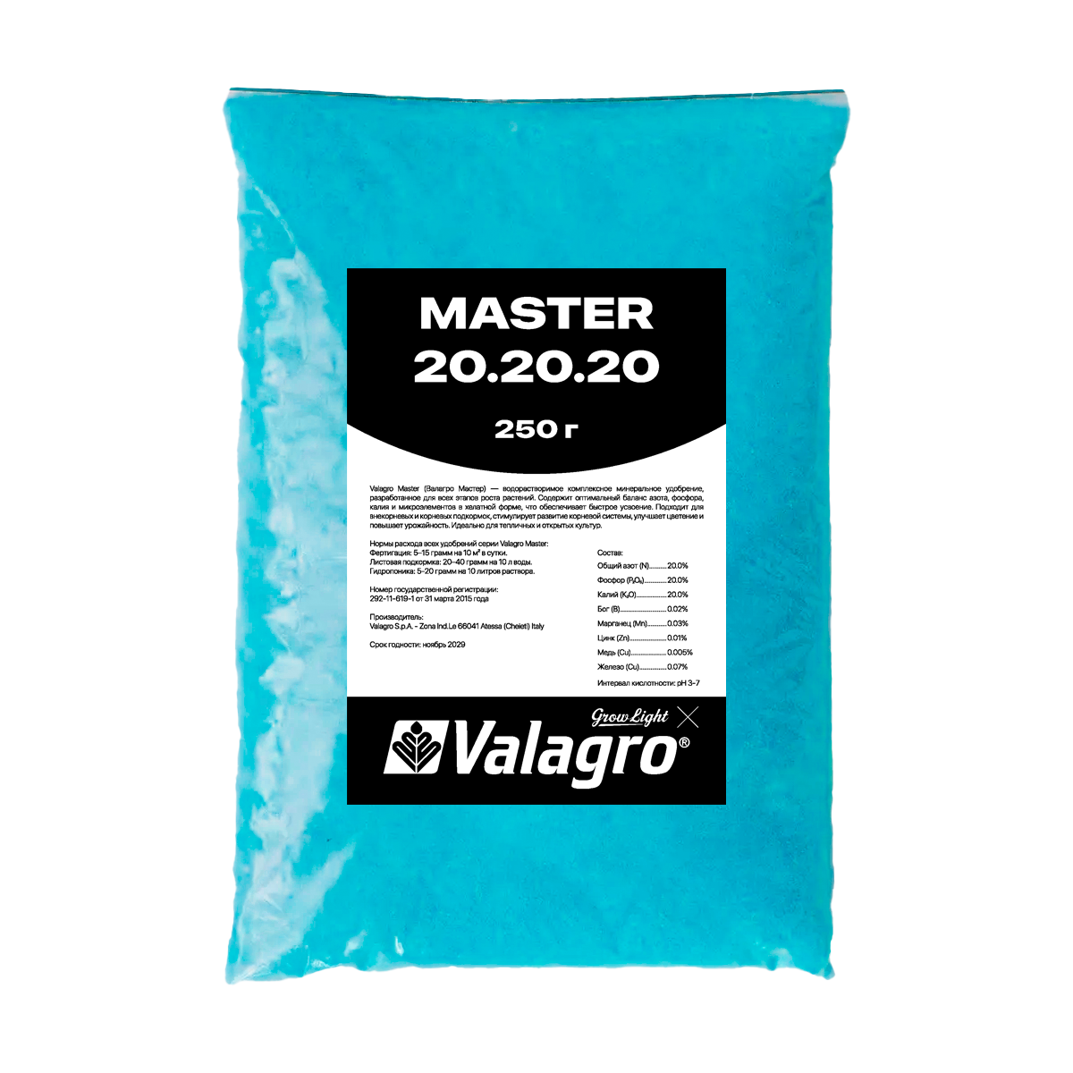 Valagro Master 20.20.20 - водорастворимое комплексное удобрение, содержащее 20% азота (N), 20% фосфора (P O ) и 20% калия (K O). Оно обогащено микроэлементами в хелатной форме, такими как железо (Fe), марганец (Mn), медь (Cu), цинк (Zn) и бор (B), что обеспечивает полноценное питание растений.