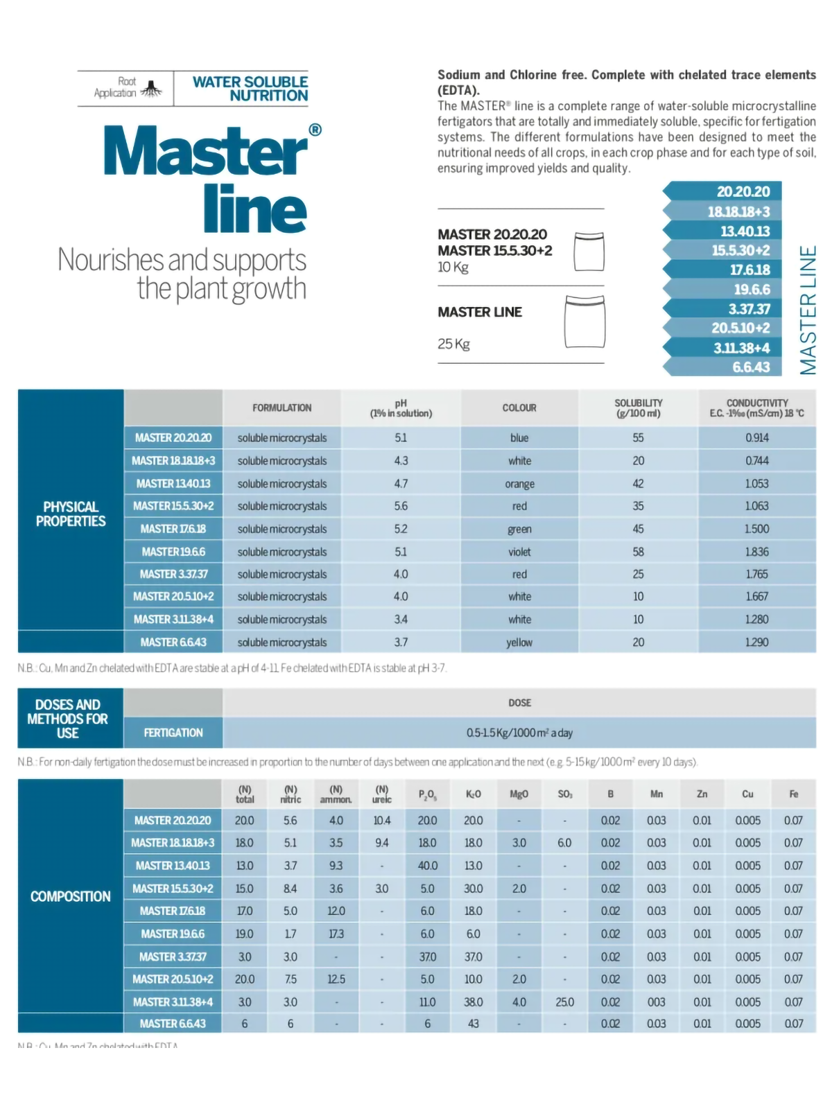 Рекомендуемые дозировки: Фертигация: 50-150 грамм на 100 м в сутки. Листовая подкормка: 200-400 грамм на 100 л воды. Применение Valagro Master 20.20.20 способствует ускоренному и равномерному росту растений, повышению урожайности и улучшению качества продукции.