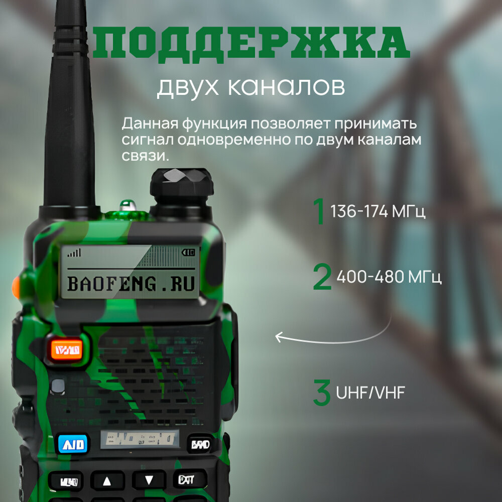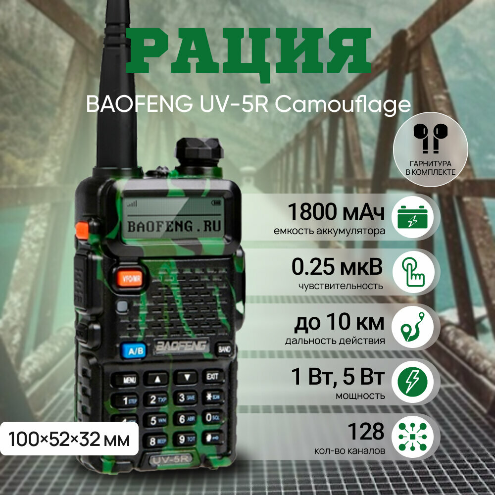 Рация Baofeng UV-5R Camouflage, аналоговая, 136-174 МГц, 400-480 МГц, 5 Вт, 1800 мАч: сравнение цен, характеристики, фото, актуальное наличие и цены.
